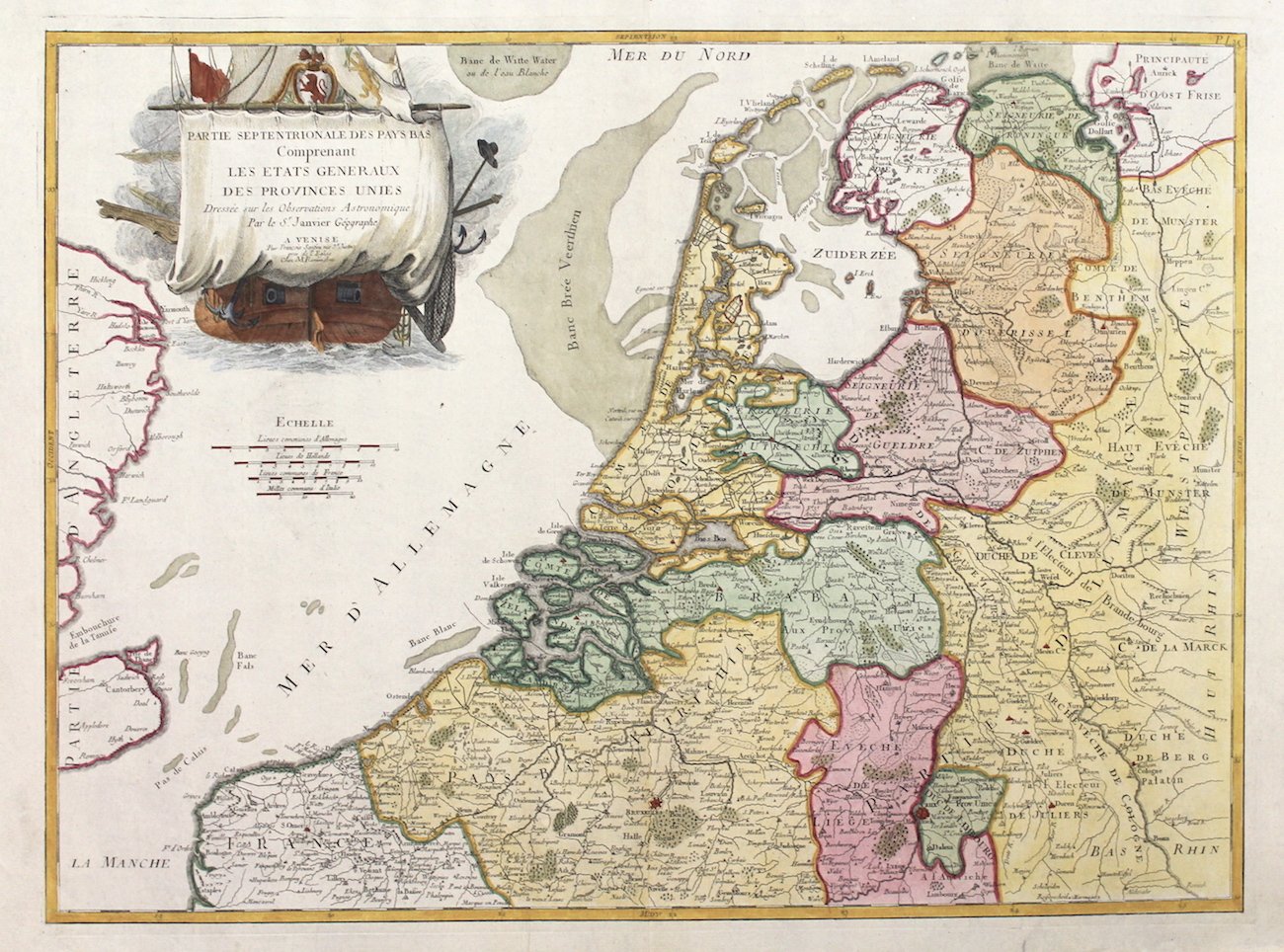 Incisione in rame, colorata, 473x637. Edizione veneziana della carta di Janvier, tratta da "Atlas Universel" stampato a Venezia fra il 1776 ed il 1784. Esemplare perfetto. Copperplate, coloured, 473x637. Venitian edition of Janvier's map; from "Atlas universel" printed in 1776-84. Perfect example.