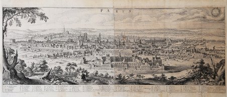 Grande veduta panoramica della città, stampata su due fogli. In basso una leggenda con la descrizione dei 56 siti principali. Incisione in rame, in ottimo stato di conservazione. Tavola pubblicata nell'opera Newe Archontologia Cosmica di Johann Philip Zabelin, meglio conosciuto con lo pseudonimo di J.L.Gottfried, arricchita dalle tavole di Mattheus Merian. Edito a Francoforte nel 1638, il Neuwe Archontologia cosmica, Das ist Beschreibung aller Kayserthumben Königreichen und Republiken der gantzen Welt [.] venne ristampato in lingua latina nel 1638 e nel 1649, in lingua tedesca nel 1646 e nel 1695. La stampe di Merian, che sembrano essere state pubblicate anche separatamente, confluirono nel Theatrum Europaeum, una sorta di giornale sulla storia delle terra (in 21 volumi in quarto), ' in lingua tedesca, iniziato da Matthäus Merian e proseguito poi da altre editori, che venne pubblicato tra il 1633 e il 1738. Matthäus Merian il vecchio (1593-1650) incisore svizzero nativo di Basilea, lavorò a Francoforte dove ebbe modo di lavorare nella bottega fondata da Theodor de Bry. Merian si segnalò, tanto da sposare Maria Magdalena de Bry, figlia di Johann Theodore de Bry, e dal 1625 circa da prendere in mano l'azienda, dandole un notevole incremento ed occupandosi in particolare dello sviluppo dei libri di topografia e di viaggi. Nella tipografia Merian lavorarono anche i figli Kaspar e soprattutto il quotato Matthaeus il giovane, i quali dopo la morte del padre proseguirono con immutato successo la gestione dell'attività che continuò fino al 1727. Nel 1638 Merian stampò la Neuwe Archontologia cosmica, das ist, Beschreibung aller Kaÿserthumben, Königreichen und Republicken der gantzen Welt opera sulla descrizione del Mondo già uscita dieci anni prima con una veste modesta che Merian rivoluzionò arricchendola con 98 tavole alcune delle quali a doppio foglio. L'Archontologia conobbe altre quattro edizioni fino al 1695 con testo o in latino o in tedesco, non omogenee per numero e tipologia di incisioni inserite. Nel 1640 venne pubblicato Itinerarium Italiæ Nov-antiquæ scritto da Martin Zeiller, ristampato nel 1688 col titolo Topographiæ Italiæ. Incisione in rame, in buono stato di conservazione. Great panoramic view of the city, printed in two sheets. A legend on lower part describes the main 56 sites. This plate was first used in Johann Ludwig Gottfried, Neuwe Archontologia Cosmica […], first published by Matthias Merian in 1638, and reissued in numerous later editions. The print seems also to have been published separately. Then it was included in the Theatrum Europaeum; was a journal on the history of the German-speaking lands by Matthäus Merian, published between 1633 and 1738 in 21 quarto volumes. Matthäus Merian the Elder (1593-1650) Swiss engraver native of Basel, worked in Frankfurt where he was able to work in the workshop founded by Theodor de Bry. Merian distinguished himself, so much so that he married Maria Magdalena de Bry, daughter of Johann Theodore de Bry, and from about 1625 he took over the company, giving it a considerable increase and dealing in particular with the development of topography and travel books. The Kaspar sons and above all the renowned Matthaeus the younger also worked in the Merian typography, who after the death of their father continued with unchanged success the management of the business which continued until 1727. In 1638 Merian printed the Neuwe Archontologia cosmica, das ist, Beschreibung aller Kaÿserthumben, Königreichen und Republicken der gantzen Welt works on the description of the World already published ten years earlier with a modest look that Merian revolutionized by enriching it with 98 tables, some of which are double sheets. The Archontologia went through four other editions up to 1695 with text either in Latin or in German, not homogeneous in terms of the number and type of engravings inserted. In 1640 Itinerarium Italiæ Nov-antiquæ written by Martin Zeiller was published, reprinted in 1688 with the title Topographiæ Italiæ. Etching, very good condition. Cfr.