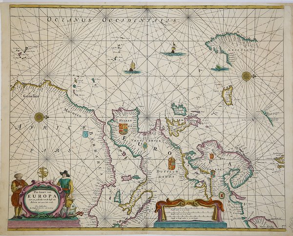 Acquaforte e bulino, 425x520 mm, firmata in lastra nel cartiglio in basso al centro: Tot Amsterdam. By Hendrick Donker inde Nieubrug:steedg.Bellissimo esemplare con magnifica coloritura coeva. Edizione molto rara.Secondo stato della carta nautica basata sul portolano di W. J. Blaeu del 1621, ridotto a formato atlante in-folio, con la data An°. 1665 nel cartiglio che viene abrasa. La mappa è per la prima volta inserita nello Zee-Atlas of Water-Waerelt - una delle quattro carte aggiunte all’originale corpus di 27 tavole nautiche - stampato con imprint t’Amsterdam By Hendrick Donker, Boeckverkooper, en Graat-boog-maker, in de Nieuwe-brug-streegh, in ‘t Stuurmans Gereetschap, Anno 1665. Lo Zee-Atlas of Water-Waerelt viene ristampato in più lingue ed edizioni, ampliate ed aggiornate. La carta dell’Europa rimane inalterata - con la data An°. 1665 - fino al 1705, quando Hendrick Donker jr. la inserisce, cancellando la data, nel De Nieuwe Groote Vermeerdere Zee-Atlas ofte Water-Werelt Vertoonende alle de Zee-Kunsten des Aerdtrycks, Seer dienstigh voor Schippers, Stuur-lieden en Liefhebbers der groote Zee-vaert. Non è chiaro se il figlio Hendrick jr. (1664 -1739 circa) aiutò suo padre nella libreria. Dopo la morte del padre nel 1699, sposò Johanna Maria Blasius e si stabilì nella casa dei suoi genitori. Continuò a pubblicare lo Zeeatlas e lo Zeespiegel fino al 1708 (ultima data che troviamo su un frontespizio). Lo Zee-Atlas of Water-Waerelt (1659) di Hendrick Doncker, tra il 1659 e il 1669, aumentò progressivamente il numero di carte, prima da 19 a 30 e poi a 50. Seguì un’edizione con mappe di grande formato: il Nieuwe Groote Vermeerderde Zeeatlas, anch’esso composto da 50 carte, che venne migliorato e ampliato per oltre 25 anni. Dopo la morte di Hendrick Doncker nel 1699, suo figlio Hendrick jr. continuò la pubblicazione e addirittura ingrandì la raccolta anche con delle carte a latitudine crescente. Bibliografia: C. Koeman, Atlantes Neerlandici: Bibliography of Terrestrial, Maritime and Celestial Atlases and Pilot Books Published in the Netherlands up to 1880 Vol. IV, Amsterdam 1970, pp. 152-189, Don 8A (28), Don 29 (3). Etching and engraving, 425x520 mm, signed in the cartouche center below: Tot Amsterdam. By Hendrick Donker inde Nieubrug: steedg.Beautiful example with magnificent old colouring. Very rare edition.Second state of the nautical chart based on the 1621 W. J. Blaeu’ pilot book, reduced to in folio format; the date An°. 1665 in the cartouche that is abraded.The map is for the first time included in the 1665 edition of the Zee-Atlas of Water-Waerelt - one of the four maps added to the original corpus of 27 nautical tables - printed with imprint t'Amsterdam By Hendrick Donker, Boeckverkooper, en Graat-boog-maker, in de Nieuwe-brug-streegh, in 't Stuurmans GereetschapThe Zee-Atlas of Water-Waerelt was reprinted in many editions and languages, increased and updated. The map of the Europe remains unchanged - with the date An °. 1665 - until 1705, when Hendrick Donker jr. inserts it, deleting the date, in the De Nieuwe Groote Vermeerdere Zee-Atlas ofte Water-Werelt Vertoonende at the de Zee-Kunsten des Aerdtrycks, Seer dienstigh voor Schippers, Stuur-lieden en Liefhebbers der groote Zee-vaert.Bibliografia: C. Koeman, Atlantes Neerlandici: Bibliography of Terrestrial, Maritime and Celestial Atlases and Pilot Books Published in the Netherlands up to 1880 Vol. IV, Amsterdam 1970, pp. 152-189, Don 8A (28), Don 29 (3). Cfr. S. Bifolco, "Mare Nostrum, Cartografia nautica a stampa del Mar Mediterraneo" (2020), pp. 164-165, tav. 71.