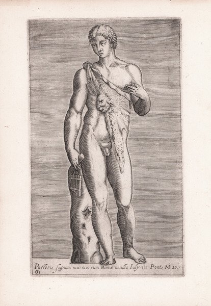 Opera tratta dall’Antiquarum statuarum urbis Romae…Io. Baptista de Cavalleris authore, la prima raccolta sistematica di illustrazioni di sculture antiche conservate nelle collezioni romane, che si deve all’opera dell’incisore e disegnatore Giovanni Battista Cavalieri (1525 circa - 1601) nella seconda metà del XVI secolo. Il repertorio, punto di riferimento per gli studi antiquari, conobbe grande diffusione e contribuì ad orientare l'interesse degli studiosi dell'epoca verso la statuaria antica. Il numero delle tavole, circa 50 nelle prime edizioni (databili circa al 1561/62) venne ampliato successivamente; prima del 1584 furono pubblicati i libri I e II con 100 incisioni numerate di sculture, organizzate per collezioni di appartenenza. Nel 1594 videro la luce il III e IV volume dell’opera, in cui comparvero altre 100 nuove tavole, stavolta ordinate in base all’iconografia dei soggetti. Le sculture sono raffigurate su sfondi neutri, privi di riferimenti architettonici. L’opera, con il titolo ' Antiquarum statuarum Urbis Romae primus, ' senza data, venne dedicata prima a Ottone Truchsess von Walburg – prima in qualità di diacono di S. Maria in Trastevere (1561/62) e poi di cardinale di Albano (1562/70). In seguito, con il titolo ' Antiquarum statuarum Urbis Romae primus et secundus liber ' il frontespizio reca la dedica al cardinale Ludovico Madruzzo, ed è databile al 1584/85. Nel 1594, con il titolo ' Antiquarum Statuarum Urbis Romae tertius et quartus liber, escono cento nuove tavole con dedica al cardinale G. Paluzzi degli Albertoni, del giugno 1593. Si tenga presente che, mentre nei primi due libri le statue erano pubblicate secondo le collezioni, nel terzo e quarto sono raggruppate per soggetto. La raccolta contiene, oltre alle incisioni di Giovanni Battista Cavalieri alcune tavole firmate da Cherubino Alberti, Orazio de Santis e altri famosi incisori dell’epoca. Giovanni Battista de Cavalieri o Cavalleris fu incisore, stampatore e editore. Originario di Villa Lagarina, nei pressi di Trento, risulta attivo a Venezia (dal 1559) e a Roma, dove nel 1577 apri una bottega nel quartiere Parione. Risiedeva nel vicolo di Palazzo Savelli, con uno studio vicino all’abitazione. Divenne cognato del celebre editore Lorenzo Vaccari. Realizzo lastre per Antonio Salamanca, Antonio Lafreri e Bartolomeo Faleti. Iniziò a pubblicare le sue opere intorno al 1560, ma sempre in partnership con altri: nel 1567 con Perino Zecchini e nel 1576 con Lorenzo Vaccari. Nel 1577 assunse uno stampatore, Francesco Cornuti, pubblicando opere di suoi contemporanei, tra cui Francesco Salviati, Daniele da Volterra, Raffaello, Michelangelo, Polidoro da Caravaggio, Livio Agresti e Baccio Bandinelli. ' Bulino, stampato su carta vergata coeva, in ottimo stato di conservazione. Bibliografia Thomas Ashby, ' Antiquae Statuae urbis Romae, in ' Papers of the British School at Rome, IX (1920), pp. 109-158; S. Weber, ' Artisti trentini ed artisti che operarono nel Trentino, Trento 1933, pp. 72 ss. Plate taken from the ' Antiquarum statuarum urbis Romae.Io. Baptista de Cavalleris authore, ' the first systematic collection of illustrations of ancient sculptures preserved in Roman collections, which is due to the work of the engraver and draftsman Giovanni Battista Cavalieri (1525 circa - 1601) in the second half of the 16th century. The repertory, a point of reference for antiquarian studies, was widely circulated and contributed to direct the interest of scholars of the time towards ancient statuary. The number of plates, about 50 in the first editions (datable to about 1561/62) was subsequently enlarged; before 1584 books I and II were published with 100 numbered engravings of sculptures, organized according to the collections they belonged to. In 1594 come to the light of the III and IV volume of the work, in which appeared other 100 new tables, this time ordered according to the iconography of the subjects. The sculptures are depicted on neutral backgrounds, without architectural references. The work, with the title ' Antiquarum statuarum Urbis Romae primus, ' undated, was first dedicated to Ottone Truchsess von Walburg - first as deacon of S. Maria in Trastevere (1561/62) and then as cardinal of Albano (1562/70). Later, with the title ' Antiquarum statuarum Urbis Romae primus et secundus liber, ' the frontispiece is dedicated to Cardinal Ludovico Madruzzo, and can be dated 1584/85. In 1594, with the title ' Antiquarum Statuarum Urbis Romae tertius et quartus liber, ' one hundred new plates were published with a dedication to Cardinal G. Paluzzi degli Albertoni, dated June 1593. Please note that, while in the first two books the statues were published according to collections, in the third and fourth are grouped by subject. The collection contains, in addition to the engravings of Giovanni Battista Cavalieri some plates signed by Cherubino Alberti, Orazio de Santis and other famous engravers of the time. Giovanni Battista de Cavalieri or Cavalleris was an engraver, printer and publisher. Born in Villa Lagarina, near Trento, is active in Venice (since 1559) and Rome, where in 1577 opened a workshop in the Parione district. He resided in the alley of Palazzo Savelli, with a studio near the house. He became brother-in-law of the famous publisher Lorenzo Vaccari. He made plates for Antonio Salamanca, Antonio Lafreri and Bartolomeo Faleti. He began to publish his works around 1560, but always in partnership with others: in 1567 with Perino Zecchini and in 1576 with Lorenzo Vaccari. In 1577 he hired a printer, Francesco Cornuti, publishing works by his contemporaries, including Francesco Salviati, Daniele da Volterra, Raphael, Michelangelo, Polidoro da Caravaggio, Livio Agresti and Baccio Bandinelli. Engraving, printed on contemporary laid paper, in excellent condition. Bibliografia Thomas Ashby, ' Antiquae Statuae urbis Romae, in ' Papers of the British School at Rome, IX (1920), pp. 109-158; S. Weber, ' Artisti
