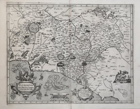 Carta geografica tratta dal ' L’Italia ' a cura di Fabio Magini, edito a Bologna nel 1620, tre anni dopo la prematura morte del padre. Composto da un breve testo descrittivo di sole 24 carte, l’opera è corredata di 61 carte geografiche della penisola, e costituisce il primo esempio di atlante italiano. L’opera è per intero di mano del Magini, che iniziò la realizzazione delle carte nel 1594 circa, dando alla luce per prima nel 1595 la carta del territorio di Bologna. Tutte le carte vennero alle stampe quindi prima del 1620, nelle loro stesure provvisorie, successivamente corrette ed aggiornate per l’edizione definitiva. Per la realizzazione delle lastre il Magini si servì di due dei più famosi intagliatori dell’epoca: il belga Arnoldo Arnoldi e l’inglese Benjamin Wright. ' Le carte del Lazio del Magini sono di complessa analisi. Egli divide per la prima volta la regione in due parti, usando come limite il corso del Tevere e dell’Aniene. ' La carta in questione comprende i territori a nord dei due fiumi ed è il prodotto dell’esame di diverse carte. L’autore infatti delinea la costa fino a Civitavecchia seguendo al carta del senese del Buonsignori (1584), la parte della Tuscia è ispirata dal Bellarmato (1536), la parte del lago di Bolsena e della Sabina è tradotta dal Danti, mentre per la campagna a nord di Roma si vede l’influenza della mitica carta di Eufrosino della Volpaia del 1547. In basso, nel cartiglio a sinistra, il titolo ' PATRIMONIO DI S.PIETRO, SABINA et Ducato di Castro. ' Al centro la scala grafica ' Miglia dieci ' (10 miglia pari a mm 50), nel cartiglio a destra la dedica ' All’ Ill.mo ' et Rev.mo ' mio Sig.r ' et P[at]ron[us] Col.mo ' il S.r ' Card:e ' Aldobrandini. Fabio di Gio. Ant.o ' Magini. ' Nel lato destro una vignetta raffigurante la lupa con Romolo e Remo. Orientazione nei quattro lati al centro con il nome dei punti cardinali ' Septentrio, Meridies, Oriens, Occidens, ' il nord in alto. Graduazione ai margini di 1’ in 1’ da 41° 30’ a 42° 29’ di latitudine, e da 34° 51’ 10’’ a 36° 38’ 10’’ di longitudine. Incisa da Benjamin Wright dopo il 1606. In ottimo stato di conservazione. Bibliografia Almagià (1960): pp. 24-25, tav. XLIII; Istituto di Studi Romani, a cura di A. Frutaz, "Le Carte del Lazio", XXII.1, tav. 53. Map taken from ' L'Italia ' edited by Fabio Magini, published in Bologna in 1620, three years after the untimely death of his father. Composed of a short descriptive text of only 24 pages, the work is accompanied by 61 maps of the peninsula, and is the first example of an Italian atlas. The work is entirely by the hand of Giovanni Antonio Magini, who began the realization of the maps in 1594 or so; the first dated map (1595) the map of the territory of Bologna. All the maps were printed before 1620, in their provisional drafts, later corrected and updated for the final edition. For the realization of the plates Magini used two of the most famous engravers of the time: the Belgian Arnoldo Arnoldi and the English Benjamin Wright. Copperplate, in good condition. ' Magini's maps of Latium have a complex background. He is the first to divide this region into two parts, using the courses of the Aniene and Tiber rivers as borders. This particular map shows the territories situated to the north of these two rivers and is the outcome of the study of previous works.The coastline up to the town of Civitavecchia is after Buonsignori while the northwestern part of the region was inspired by Bellarmato. ' The area around the lake of Bolsena is taken from Danti and, finally, in the rendering of the countryside in the immediate whereabouts of the northern suburbs of Rome the influence of Eufrosino della Volpaia's 1547 map can be seen. Engraved by Benjamin Wright after 1606. In basso, nel cartiglio a sinistra, il titolo ' PATRIMONIO DI S.PIETRO, SABINA et Ducato di Castro. ' Al centro la scala grafica ' Miglia dieci ' (10 miglia pari a mm 50), nel cartiglio a destra la dedica ' All’ Ill.mo ' et Rev.mo ' mio Sig.r ' et P[at]ron[us] Col.mo ' il S.r ' Card:e ' Aldobrandini. Fabio di Gio. Ant.o ' Magini. ' Nel lato destro una vignetta raffigurante la lupa con Romolo e Remo. Orientazione nei quattro lati al centro con il nome dei punti cardinali ' Septentrio, Meridies, Oriens, Occidens, ' il nord in alto. Graduazione ai margini di 1’ in 1’ da 41° 30’ a 42° 29’ di latitudine, e da 34° 51’ 10’’ a 36° 38’ 10’’ di longitudine. Incisa da Benjamin Wright dopo il 1606. In ottimo stato di conservazione. Bibliografia Almagià (1960): pp. 24-25, tav. XLIII; Frutaz (1972): pp. 41-42, XXII, tav. 53. Cfr.
