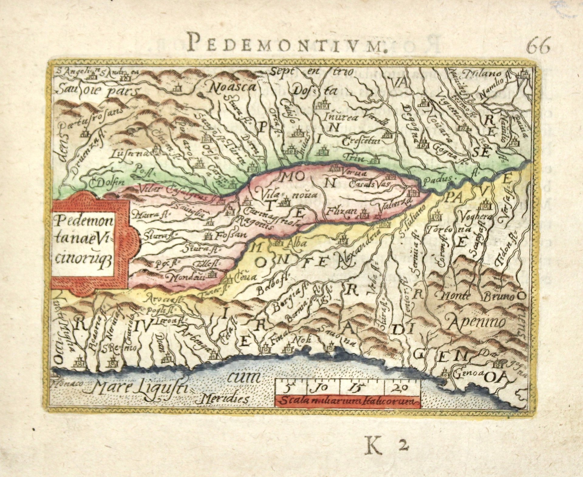 Incisione in rame, fascinosa coloritura posteriore, mm 80x110. Piacevole carta in miniatura tratta da "Epitome du Theatre du monde" una edizione tascabile del "Theatrum Orbis Terrarum" il primo atlante moderno, comprendente carte di tutte le zone del mondo; la geniale intuizione di Ortels, latinizzato successivamente in Ortelius, fu appunto questa: prima d'allora la produzione cartografica era stata irregolare, locale a livello di produzione ed i pochi atlanti, i cosiddetti "Atlanti Lafreriani" erano costituiti su richiesta raccogliendo solo carte di alcune zone. Ortelius riunì in un unico corpus la produzione cartografica eterogenea del periodo, costituendo la base per un'impresa editoriale di enorme successo, pubblicata tra il 1570 e il 1612. Buon esemplare, tracce di sporco superficiali.