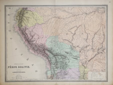 Carta della parte occidentale del Sud America, che descrive il Perù e la Bolivia. La raccolta cartografica di Eugène Andriveau-Goujon venne pubblicata per la prima volta nel 1848 circa, con il titolo di ' Atlas classique et universel de geographie ancienne et moderne, contenant les decouvertes et les divisions les plus nouvelles dans les cinq parties du monde pour servir a la lecture des voyages, des ouvrages historiques et des meilleurs traites de geographie. Publie par J. Andriveau-Goujon. Adopte par le Ministre de la Guerre pour les bibliotheques regimentaires. Successive ristampe contengono il corpus originale di carte e una cospicua addenda. Eugène Andriveau-Goujon (1832 - 1897) fu un editore di mappe e cartografo attivo nella Parigi del XIX secolo. L'azienda fu creata nel 1825 quando Eugène Andriveau sposò la figlia dell'editore di mappe Jean Goujon, dando così vita ad Andriveau-Goujon. Le mappe di Andriveau-Goujon sono spesso confuse da identificare in quanto possono essere alternativamente denominate J. Goujon, J. Andriveau, J. Andriveau-Goujon, E. Andriveau-Goujon o semplicemente Andriveau-Goujon. Ciò si riferisce alle molteplici generazioni della dinastia Andriveau-Goujon e alla tendenza a ripubblicare materiale più vecchio senza aggiornare l'imprint. Le prime mappe con l'imprint Andriveau-Goujon furono pubblicate da Jean Andriveau-Goujon. Egli passò l'attività al figlio Gilbert-Gabriel Andriveau-Goujon, che nel 1858 passò al figlio Eugène Andriveau-Goujon, sotto la cui gestione l'azienda fu più prolifica. Andriveau-Goujon pubblicò numerose mappe tascabili e atlanti di pregio per tutto il XIX secolo e collaborò spesso con altri importanti cartografi francesi dell'epoca, come Brue e Levasseur. Lo stock della ditta fu acquisito da M. Barrère nel 1892. Litografia con colori originali, buono stato di conservazione. Map of the western part of South America, describing Peru and Bolivia. Eugène Andriveau-Goujon's cartographic collection was first published in about 1848 under the title ' Atlas classique et universel de geographie ancienne et moderne, contenant les decouvertes et les divisions les plus nouvelles dans les cinq parties du monde pour servir a la lecture des voyages, des ouvrages historiques et des meilleurs traites de geographie. Publie par J. Andriveau-Goujon. Adopte par le Ministre de la Guerre pour les bibliotheques regimentaires. Subsequent reprints contain the original body of maps and a substantial addendum. Eugène Andriveau-Goujon (1832 - 1897) was a map publisher and cartographer active in 19th century Paris. The firm was created in 1825 when Eugène Andriveau married the daughter of map publisher Jean Goujon - thus creating Andriveau-Goujon. Maps by Andriveau-Goujon are often confusing to identify as they can be alternately singed J. Goujon, J. Andriveau, J. Andriveau-Goujon, E. Andriveau-Goujon, or simply Andriveau-Goujon. This refers to the multiple generations of the Andriveau-Goujon dynasty and the tendency to republish older material without updating the imprint. The earliest maps to have the Andriveau-Goujon imprint were released by Jean Andriveau-Goujon. He passed the business to his son Gilbert-Gabriel Andriveau-Goujon, who in 1858 passed to his son, Eugène Andriveau-Goujon, under whose management the firm was most prolific. Andriveau-Goujon published numerous fine pocket maps and atlases throughout the 19th century and often worked with other prominent French cartographers of the time such as Brue and Levasseur. The firm's stock was acquired by M. Barrère in 1892. Litograph with original colour, good condition. Cfr.