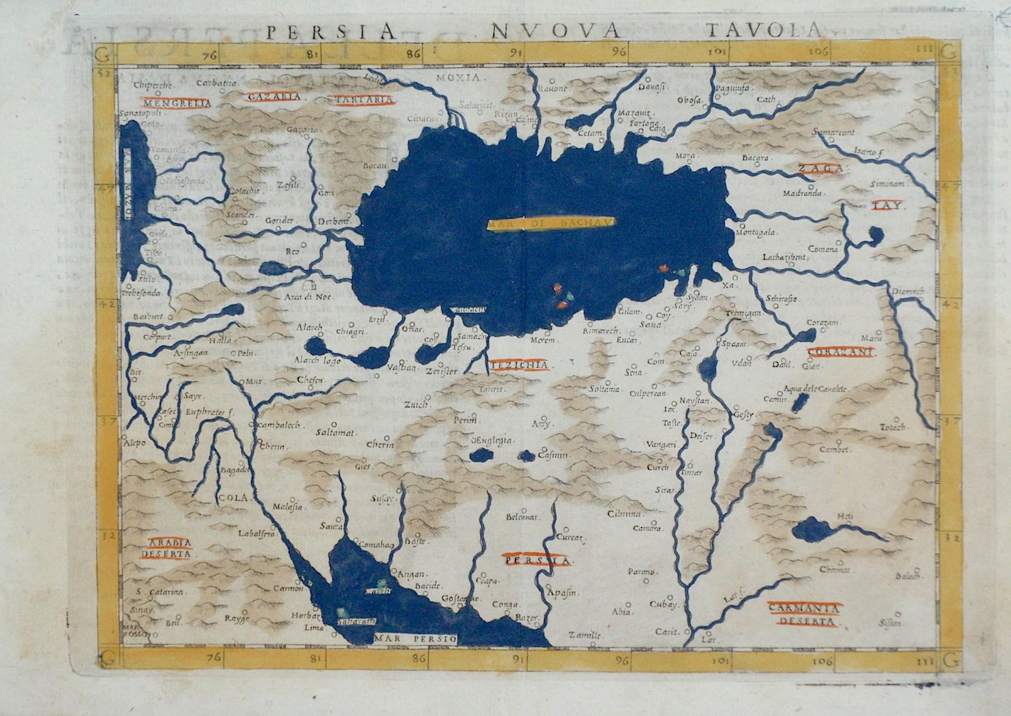 Incisione in rame, colorata a mano, di mm 190x263, tratta dall'edizione veneziana della "Geographia" curata da Ruscelli. Buon esemplare.