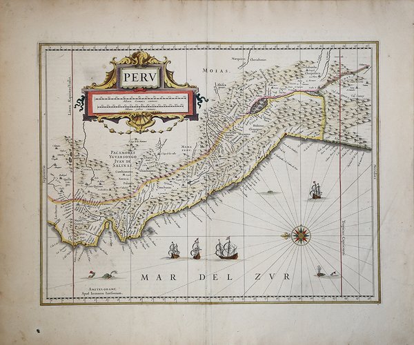 Carta del Perù dall'Atlas Contractus del Janssonius, pubblicato dagli eredi dopo il 1656.Include grande un cartiglio decorativo con il titolo, rosa dei venti, 4 velieri e 3 mostri marini e quasi 100 nomi di luoghi. Joannes Janssonius, figlio dell'editore di Arnhem Jan Janssen, sposò Elisabeth Hondius, figlia di Jodocus Hondius, ad Amsterdam nel 1612. Dopo il suo matrimonio, si stabilì in questa città come libraio ed editore di materiale cartografico. Nel 1618 si stabilì ad Amsterdam accanto alla libreria di Willem Jansz. Blaeu, entrando in una seria competizione. Le sue attività non riguardavano solo la pubblicazione di atlanti e libri, ma anche di mappe singole e un vasto commercio di libri con filiali a Francoforte, Danzica, Stoccolma, Copenaghen, Berlino, Koningsbergen, Ginevra e Lione. Nel 1631 iniziò a pubblicare atlanti insieme a Henricus Hondius. Nei primi anni 1640 Henricus Hondius lasciò l'attività di pubblicazione di atlanti completamente a Janssonius. La concorrenza con Joan Blaeu, figlio e successore di Willem, nella produzione di atlanti spinse Janssonius ad ampliare il suo Atlas Novus finalmente in un'opera di sei volumi, in cui furono inseriti un atlante marino e un atlante del Vecchio Mondo. Dopo la morte di Joannes Janssonius, il negozio e la casa editrice furono continuati dagli eredi sotto la direzione di Johannes van Waesbergen (c. 1616-1681), genero di Joannes Janssonius. Le matrici degli atlanti di Janssonius furono in seguito vendute a Schenk e Valck. Incisione in rame, bella coloritura coeva, in ottime condizioni. Decorative map of Peru, featuring large decorative cartouche, compass rose, 4 sailing ships and 3 sea monsters. Nearly 100 place names shown, with extensive details throughout the map. An unusual example, with no text on the verso. Joannes Janssonius (Arnhem, 1588-1664), son of the Arnhem publisher Jan Janssen, married Elisabeth Hondius, daughter of Jodocus Hondius, in Amsterdam in 1612. After his marriage, he settled down in this town as a bookseller and publisher of cartographic material. In 1618 he established himself in Amsterdam next door to Blaeu’s book shop. He entered into serious competition with Willem Jansz. Blaeu. His activities not only concerned the publication of atlases and books, but also of single maps and an extensive book trade with branches in Frankfurt, Danzig, Stockholm, Copenhagen, Berlin, Koningsbergen, Geneva, and Lyon. In 1631 he began publishing atlases together with Henricus Hondius. In the early 1640s Henricus Hondius left the atlas publishing business completely to Janssonius. Competition with Joan Blaeu, Willem’s son and successor, in atlas production prompted Janssonius to enlarge his Atlas Novus finally into a work of six volumes, into which a sea atlas and an atlas of the Old World were inserted. After the death of Joannes Janssonius, the shop and publishing firm were continued by the heirs under the direction of Johannes van Waesbergen (c. 1616-1681), son-in-law of Joannes Janssonius. The copperplates from Janssonius’s atlases were afterwards sold to Schenk and Valck. A nice old color example. Cfr.