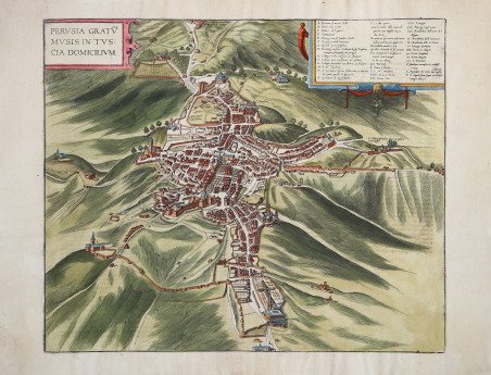 Bella pianta prospettica di Perugia, basata sull'anonima pianta, attribuita a Mario Cartaro, incisa nel 1582/85. "Vista a volo d'uccello da sud, la città si estende su diverse colline e in alcuni punti è protetta da mura e porte che la fanno sembrare una fortezza. Alcune delle sue chiese più importanti si trovano alla periferia: al margine settentrionale della città si trovano Sant'Angelo al centro e, vicino al confine meridionale, San Pietro con il tetto piatto. Un po' più in alto nell'immagine si trova San Domenico. Il complesso di San Francesco e San Bernardino si trova al margine occidentale della città. Al centro si trova la cattedrale di San Lorenzo, una chiesa a sala gotica. Di fronte al campanile della cattedrale si trova la celebre Fontana Maggiore. Insediamento ingegnoso, Perugia fiorì nel Medioevo. Appartenne allo Stato Pontificio dal 1520 al 1680. Oggi la città, con la sua università fondata nel 1276, è il capoluogo della provincia dell'Umbria". (Taschen) L’opera è inserita nel ' Civitates Orbis Terrarum, il primo atlante devoto esclusivamente alle piante e vedute delle principali città del mondo. Il primo volume delle ' Civitates Orbis Terrarum ' fu pubblicato a Colonia nel 1572. Il sesto e ultimo volume apparve nel 1617. Questo grande atlante di città – cartografia urbana - curato da Georg Braun e inciso in gran parte da Franz Hogenberg, conteneva 546 prospettive, vedute a volo d'uccello e vedute cartografiche di città di tutto il mondo. Franz Hogenberg realizzò le tavole dei primi quattro volumi e Simon van den Neuwel (Novellanus, attivo dal 1580) quelle dei volumi V e VI. Georg Braun (1541-1622), un ecclesiastico di Colonia, fu il principale redattore dell'opera e fu molto aiutato nel suo progetto dalla vicinanza e dal continuo interesse di Abraham Ortelius, il cui ' Theatrum Orbis Terrarum ' del 1570 fu, come raccolta sistematica e completa di mappe di stile uniforme, il primo vero atlante. Le ' Civitates, ' in effetti, erano destinate ad accompagnare il ' Theatrum, ' come indicato dalla somiglianza dei titoli e dai riferimenti contemporanei sulla natura complementare delle due opere. Tuttavia, le ' Civitates ' erano progettate per avere un approccio più popolare, senza dubbio perché la novità di una raccolta di piante e vedute di città rappresentava un'impresa commerciale più rischiosa di un atlante mondiale, per il quale c'erano stati diversi precedenti di successo. Franz Hogenberg (1535-1590) era figlio di un incisore di Monaco che si era stabilito a Malines. Incise la maggior parte delle tavole del ' Theatrum ' di Ortelius e la maggior parte di quelle delle ' Civitates, e potrebbe essere anche indicato come il responsabile dell'origine del progetto. Oltre un centinaio di artisti e cartografi diversi, il più importante dei quali fu l'artista di Anversa Georg Hoefnagel (1542-1600), fornirono i disegni per le tavole delle ' Civitates. Hoefnagel non solo contribuì alla maggior parte del materiale originale per le città spagnole e italiane, ma rielaborò e modificò anche quello di altri collaboratori. Dopo la morte di Hoefnagel, il figlio Jakob continuò il lavoro per le ' Civitates. Gli autori della raccolta si proponevano di raffigurare "non icones et typi urbium", cioè non immagini generiche e tipizzate, "sed urbes ipsae admirabili caelaturae artificio, spectantium oculis subiectae appareant": non intendeva alludere o idealizzare, ma rappresentare fedelmente sulla carta, riprodurre esattamente, e in tempo reale, ciò che l'occhio vede, come annunciato nella prefazione al primo volume delle ' Civitates Orbis Terrarum. Incisione in rame, magnifica coloritura coeva, in ottimo stato di conservazione. A nice map of Perugia, after the Mario Cartaro map engraved in 1582/85. "Seen from the south in a bird's-eye view, the city sprawls across several hills and in places is protected by city walls and gates that make it look like a fortress. Some of its most important churches are on the periphery: on the northern edge of the city are Sant'Angelo at the centre and, near the southern boundary, San Pietro with a flat roof. Slightly above it in the picture is San Domenico. The complex comprising San Francesco and San Bernardino is on the western edge of the city. At the centre is the cathedral of San Lorenzo, a Gothic hall church. In front of the cathedral tower stands the celebrated Fontana Maggiore. An early ingenous settlement, Perugia flourished in the Middle Ages. It belonged to the Papal States from 1520 to 1680. Today the city with its university founded in 1276 is the capital of the province of Umbria". (Taschen) The work is included in the ' Civitates Orbis Terrarum, the first atlas devoted exclusively to plans and views of the world's major cities. Printed in six volumes between 1572 and 1617 it was so successful and widespread that several editions translated into Latin, German and French were printed. The first volume of the ' Civitates Orbis Terrarum ' was published in Cologne in 1572. The sixth and the final volume appeared in 1617. This great city atlas, edited by Georg Braun and largely engraved by Franz Hogenberg, eventually contained 546 prospects, bird-eye views and map views of cities from all over the world. Fransz Hogenberg produced the plates for the first four books, and Simon van den Neuwel (Novellanus, active since 1580) those for volumes V and VI. Georg Braun (1541-1622), a cleric of Cologne, was the principal editor of the work, and was greatly assisted in his project by the close, and continued interest of Abraham Ortelius, whose ' Theatrum Orbis Terrarum ' of 1570 was, as a systematic and comprehensive collection of maps of uniform style, the first true atlas. The ' Civitates, ' indeed, was intended as a companion for the ' Theatrum, ' as indicated by the similarity in the titles and by contemporary references regarding the complementary nature of two works. Nevertheless, the ' Civitates ' was designs to be more popular in a