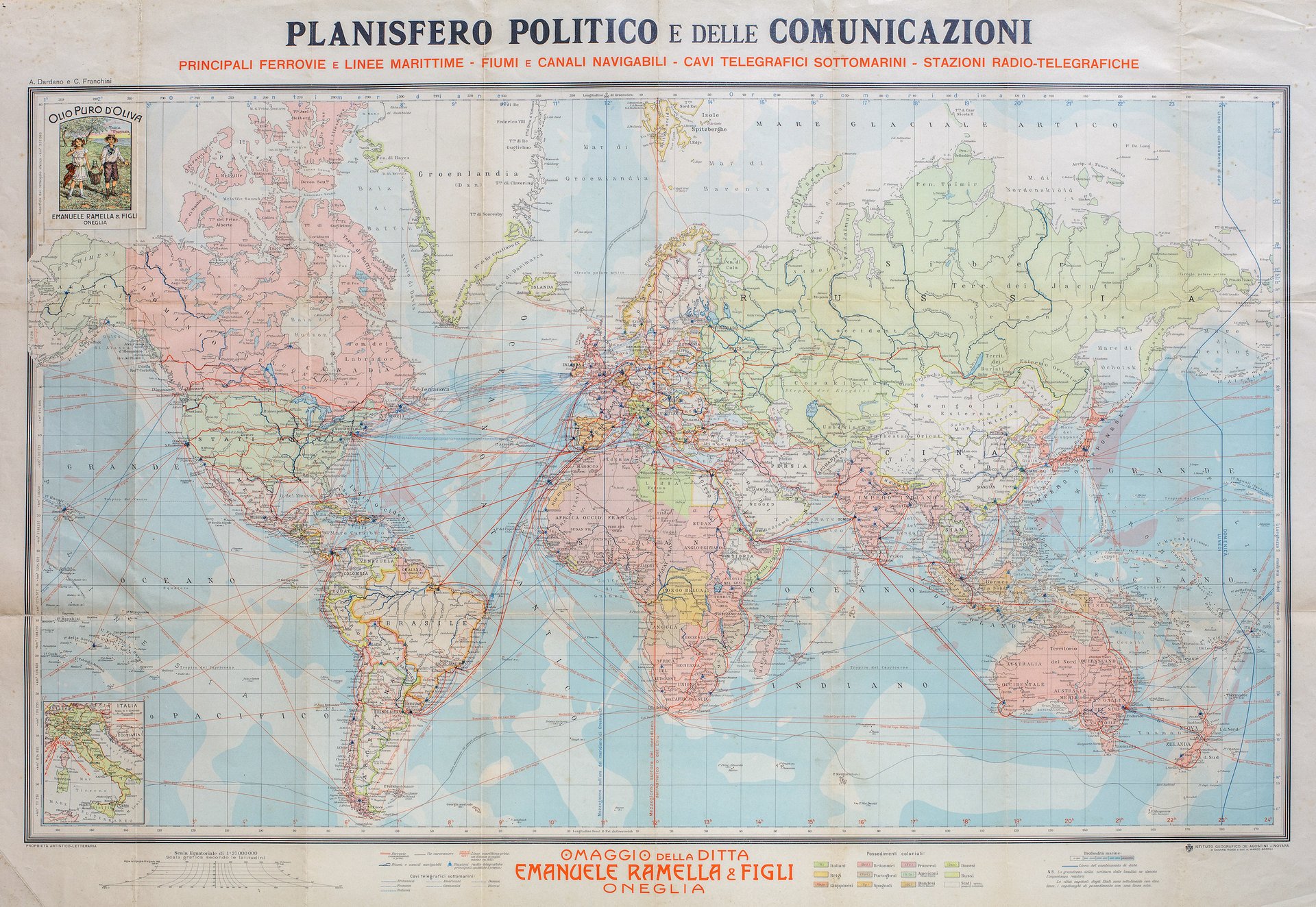 Grande carta del mondo entro reticolo cartografico a colori, dedicata alle tecnologie e categorie di comunicazioni dell'epoca: in essa vi sono tracciati gli stati con i possedimenti delle rispettive colonie, le strade ferrate transcontinentali, vie carovaniere, fiumi e canali navigabili, stazioni radio-telegrafiche principali, pubbliche e private, cavi telegrafici sottomarini, le profondità marine. Scala delle miglia e gradi di latitudine e longitudine riportati ai margini. In alto a sinistra pubblicità dell'olio di oliva della ditta Ramella di Oneglia.<BR>Dardano Achille (Firenze 1870/ Roma 1938). prese parte a un concorso della Società geografica italiana nel 1890 che offriva un sussidio pecuniario a giovani interessati all'apprendimento teorico e pratico della cartografia e alla collaborazione sia ai lavori relativi al Grande Atlante di geografia moderna; aveva cominciato a dare il suo contributo come cartografo all'Istituto De Agostini, fondato a Roma il 1º giugno 1901.<BR>Quando nel 1912 fu istituito il Ministero delle Colonie e l'aspetto topografico e geografico assunse nella conoscenza dei territori coloniali un'importanza preminente, con un decreto in data 5 maggio 1914 fu istituito un Ufficio cartografico,<BR>la collaborazione del D. col ministero aveva avuto inizio fin dal 1917 con una carta dei confini della Colonia Eritrea.Viene anche ricordato per l' assistenza tecnica alle missioni che fissarono i confini delle colonie italiane. Il D. dette un valido contributo all'Enciclopedia Italiana con l'esecuzione delle carte, in numero di circa duemila, che ne accompagnano i testi. Bell'esemplare, accenni di pieghe editoriali. Cartella vetrina grande.<BR>