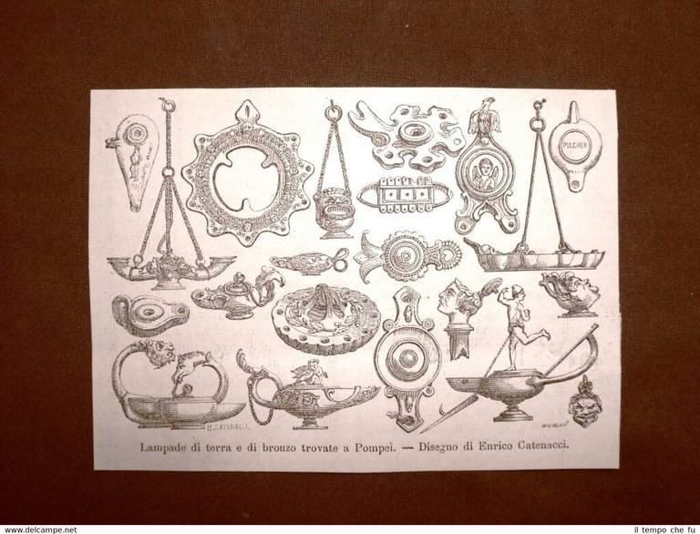 Rara stampa estratta da pubblicazione del 1863. .stampa che ha quindi oltre 155 anni! Pompei nel 1863 Lampade di terra e di bronzo recentemente ritrovate Napoli GDM -026 Dimensioni Cm 12,50 x 9,00 Qualora vogliate delle scansioni migliori contattateci, soddisferemo ogni vostra richiesta. Paypal Carta di credito Bonifico bancario Accuratamente adagiate su un cartoncino e protette da pellicola trasparente rigida, il tutto viene inserito dentro plico di adeguate dimensioni per proteggerne l'integrità.