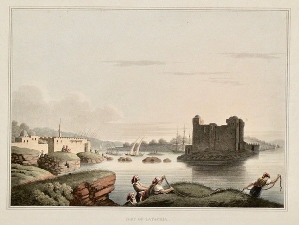 Incisione in rame all'acquatinta di mm 230x320 (l'immagine), colorata a mano d'epoca. Bella veduta della località turca con scena di pescatori in primo piano. Bell'esemplare con minimo strappetto restaurato all'angolo superiore sinistro. <BR>