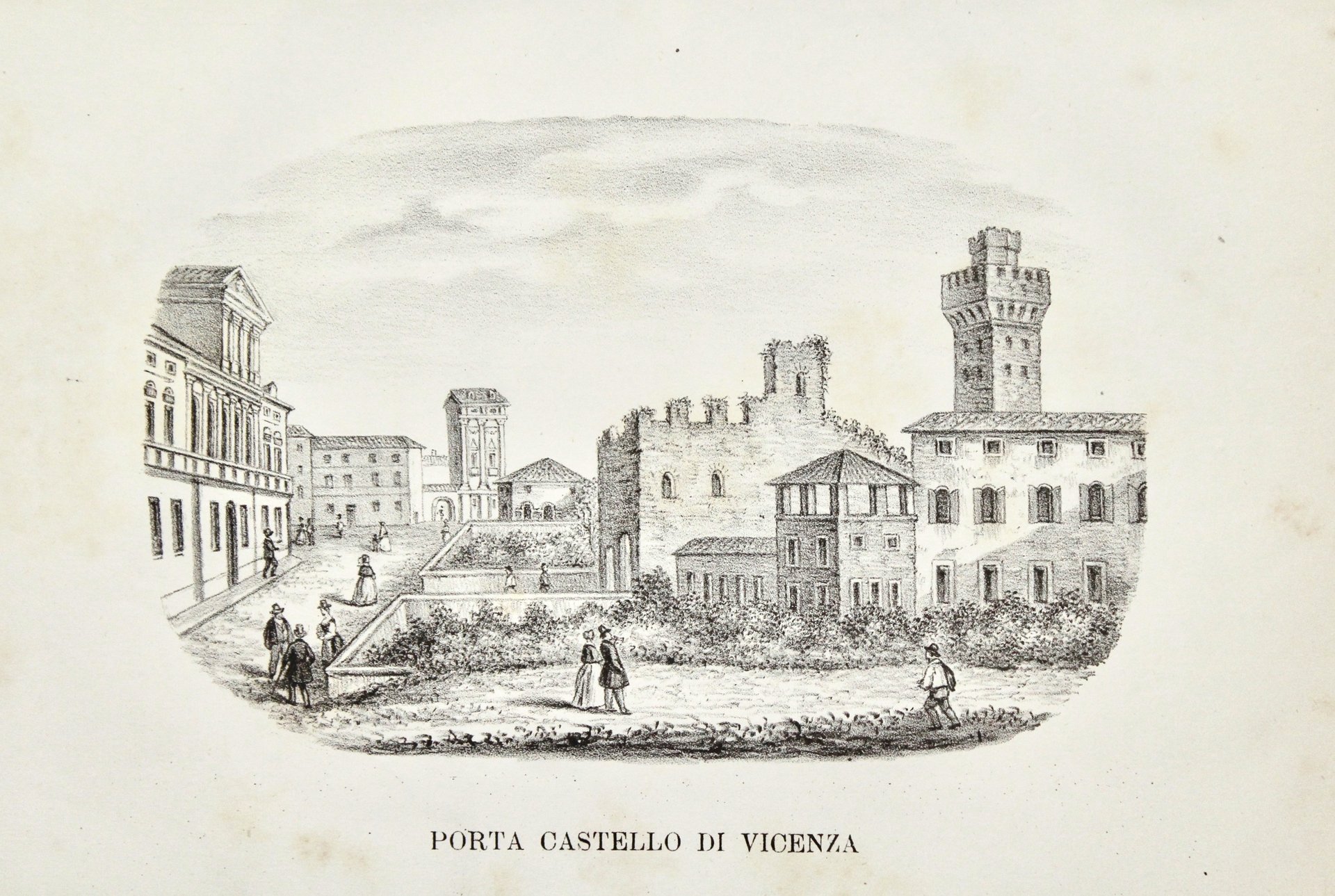 Litografia, mm 110x170. Tratta da “L’Italia pittoresca nel suo territorio, città, borghi, castelli…”. Ben conservata. Non in Rumor, Vicenza città bellissima.