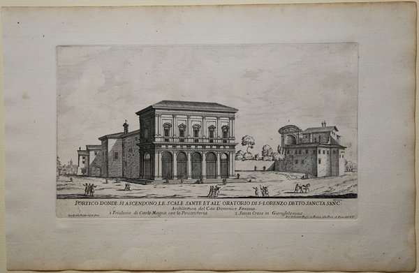 Il complesso denominato Santuario della Scala Santa comprende la Scala Santa propriamente detta e la Cappella di San Lorenzo o Sancta Sanctorum. La Scala Santa, secondo la tradizione cristiana, sarebbe stata la scala del palazzo pretorio di Pilato, sulla quale sarebbe salito Gesù per essere interrogato da Ponzio Pilato prima della crocifissione. La Cappella di S. Lorenzo, detta Sancta Sanctorum per le importanti reliquie che custodisce, fu l'oratorio privato del Papi fino al periodo del Rinascimento. Sotto l'affresco principale si legge l'iscrizione "Non est in toto sanctior orbe locus", «Non esiste al mondo luogo più santo». Di tutti gli oggetti conservati nella cappella del Sancta Sanctorum il più antico, celebre e venerato è l'immagine del SS. SALVATORE, detta anche acheropita, cioè "non fatta da mano umana". Esemplare di primo stato, avanti la numerazione, tratto da ' Il nuovo teatro delle fabriche, et edificii, in prospettiva di Roma moderna, sotto il felice pontificato di N. S. papa Alessandro VII. Opera in tre volumi, edita da Giovanni Giacomo de Rossi tra il 1665 e il 1669, illustra le fabbriche realizzate o ampliate durante il pontificato di Alessandro VII Chigi, mentre il III si riferisce alle chiese restaurate dal pontefice Clemente IX. L'opera aveva lo scopo di divulgare la nuova immagine di Roma, con i suoi palazzi, chiese e giardini, secondo un progetto unitario di espansione urbana, in sintonia con i criteri del colto e raffinato Fabio Chigi: il papa, infatti, decise di aprire nuove strade, di abbellire con fontane e monumenti la città, anche a dimostrazione della potenza finanziaria e culturale della sua famiglia. Prima di allora l'incisione di veduta a Roma, che pure aveva prodotto numerose serie dì stampe da Etienne Dupérac a Giacomo Lauro, si era interessata principalmente alla ripresa della città antica. Bisognerà attendere proprio il completamento dei rinnovamenti urbanistici e delle realizzazioni architettoniche dei papi seicenteschi, per assistere alla diffusione di raccolte dedicate alla città moderna. Giovan Battista Falda ha contribuito, con la vasta serie di incisioni di vedute, a divulgare un'immagine della città di Roma legata alla magnificenza e munificenza dei Papi seicenteschi: città ricca di chiese, palazzi, giardini che si affiancavano ai resti del glorioso passato. L'incisore dedicò tutta la sua pur breve vita a creare, attraverso precise ed attente vedute prospettiche, piante e stampe su avvenimenti cittadini, canonizzazioni, ingressi di pontefici e reali stranieri, un grosso affresco unitario che celebrasse nel suo insieme la nuova grandezza raggiunta dalla Roma moderna, grazie soprattutto alla geniale e lungimirante opera di papa Alessandro VII Chigi (1655 - 1667). Dopo la morte del Falda, verrà pubblicato, sempre dalla tipografia De Rossi, ' Il quarto libro del nuovo teatro delli palazzi in prospettiva di Roma moderna dato in luce sotto il felice pontificato di nostro signore papa Innocenzo XII, di Alessandro Specchi, edito nel 1699 e naturale prosecuzione della raccolta. Acquaforte, impressa su carta vergata coeva, con margini, in ottimo stato di conservazione. Example in the first state, before the number, taken from ' Il nuovo teatro delle fabriche, et edificii, in prospettiva di Roma moderna, sotto il felice pontificato di N. S. papa Alessandro VII. One of the most important architectural projects of the seventeenth century was the urban renovation of Rome. Under the brilliant leadership of Pope Alessandro VII (1655-1667), Rome dramatically emerged as one of the most modern and beautiful cities of the new Baroque age. Within several decades spacious roadways were constructed, monumental buildings arose, and many public squares appeared with elaborate fountains and monuments. To be sure, this massive undertaking was meant to underline the absolute power of the Papacy but it also brought forth a new flowering of Italian art and architecture. ' The ' Nuovo Teatro ' was initiated in 1665 to depict the new Rome in a series of etchings. What it gave to future generations was a magnificent historical record of views etched by two of Italy's greatest architectural artists. ' The printing and publishing of these important etchings was entrusted to Giacomo de Rossi (1626-1691), the head of the most dominant Roman publishing house. ( Sons and nephews of de Rossi, in fact, continued the publishing house until 1738 when the business was sold to Pope Clement XII to form the basis of the ' Regia Calcografia.) ' Altogether, four sets of ' Nuovo Teatro ' were created during the seventeenth century. Volumes one and two were both published in the year of 1665 and dealt mainly in views of the new piazzas, gardens, terraces and their surrounding buildings. Volume 3 was published in 1669 and concentrated upon the newly constructed churches of Rome. Every plate from the first three sets was both designed and etched by the influential architectural artist, Giovanni Battista Falda (1643-1678). For reasons unknown the fourth and final volume ' Il quarto libro del nuovo teatro delli palazzi in prospettiva di Roma moderna dato in luce sotto il felice pontificato di nostro signore papa Innocenzo XII, (52 etchings) did not appear until 1699. ' It was published by Giacomo's successor, Domenico de Rossi, and featured views of the palaces and stately homes of Rome. Each plate was designed and etched by the famous architect and etcher, Alessandro Specchi (1668-1729). ' Etching, printed on contemporary laid paper, with margins, in good condition. Cfr.