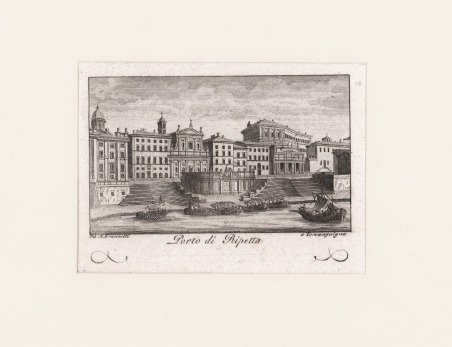 Veduta tratta dalla celebre Raccolta di num. 320 Vedute sì antiche, che moderne della città di Roma. …Incise a bulino in N. 80 rami, In Roma Nella Calcografia di Agapito Franzetti a Torsanguigna Col Permesso. ' L’opera si compone di un frontespizio calcografico e di 80 tavole numerate, ognuna composta da quattro vedute. Viene stampata senza data; molti repertori la datano intorno al 1790 circa, forse perché stampata su carta vergata. Una datazione intorno al 1800 ci sembra tuttavia più plausibile. ' Agapito Franzetti, calcografo attivo a Roma con bottega tra via del Corso e Torsanguigna, è noto per le sue piccole incisioni di veduta che servivano spesso come biglietti da visita. Tutte contengono, infatti, una linea in basso, dove si poteva apporre il proprio nome ad inchiostro. Come indicato nel titolo, le vedute raffigurano sia monumenti e antiche rovine che vedute “moderne”, con piazze, chiese e ville. Ciascuna tavola reca, in basso al centro, il nome dell’incisore. Gli artisti coinvolti sono sei: Jean-Jerome Baugean; Antonio Giuseppe Barbazza; Giovanni Battista Cipriani; Francesco Morelli; Antonio Poretta e Domenico Pronti. Molte delle vedute derivano dalla celebre opera di Giuseppe Vasi, Delle magnificenze di Roma antica e moderna. Pubblicata in 10 volumi dal 1747 al 1761, l’opera presenta 238 incisioni in rame, ciascuna incisione con testo narrativo che fornisce informazioni storiche e documentarie. ' Acquaforte, in buono stato di conservazione. ' Bibliografia: A. Bertarelli, H. Prior, Il biglietto da visita italiano. Cintributo alla storia del costume e dell'incisione nel secolo XVII, Bergamo 1911, p. 162. View of the city printed in Rome by the publisher Agapito Franzetti. Taken from Raccolta di num. 320 Vedute sì antiche, che moderne della città di Roma. …Incise a bulino in N. 80 rami, In Roma Nella Calcografia di Agapito Franzetti a Torsanguigna Col Permesso. ' The work consists of an intaglio frontispiece and 80 numbered plates, each consisting of four views. It is printed without date; many repertories date it around 1790, perhaps because it was printed on laid paper. A date around 1800 seems more plausible. Franzetti, a chalcographer working in Rome with a workshop between Via del Corso and Torsanguigna, is known for his small engravings of views that were often used as business cards. They all contain a line at the bottom where one's name could be written in ink. The small views were often printed four to a sheet. As indicated in the title, the views depict both monuments and ancient ruins and "modern" views, with squares, churches and villas. Each table bears, at the bottom center, the name of the engraver. There are six artists involved: Jean-Jerome Baugean; Antonio Giuseppe Barbazza; Giovanni Battista Cipriani; Francesco Morelli; Antonio Poretta and Domenico Pronti. ' The views are made after Giuseppe Vasi’s monumental work Delle magnificenze di Roma antica e moderna. Published in 10 volumes from 1747 to 1761, the work features 238 copper engravings, each engraving with a narrative text that provides historical and documentary information. ' Bibliografia: A. Bertarelli, H. Prior, Il biglietto da visita italiano. Contributo alla storia del costume e dell'incisione nel secolo XVII, Bergamo 1911, p. 162. Cfr.