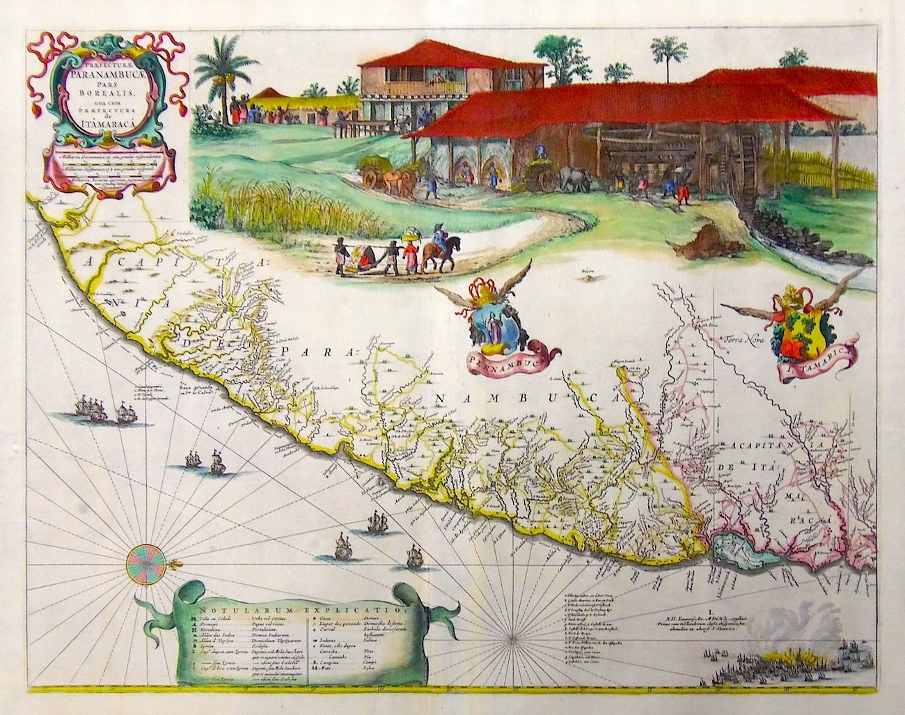 Copper engraving, mm 422x535, colored. No text on verso. One of the most decorative and beatiful maps of Brazil ever published, among the first maps not from portuguese sources, drawn after actual surveys by Georg Markgraf and Elias Herckmanns, originally in Barlaeus's Rervm per Octennivm in Brasilia published by Blaeu in 1647 and later inserted in Blaeu's Atlas Major. <BR>Richly decorated with a highly interesting and decorative scene depicting life in a farm; the bottom part of the map depicts sea battles. The complete set of maps was also assembled into a large wall map, Brasilia qua parte paret Belgis. The maps then appeared in the Atlas Maior in 1662. Good condition, two light vertical long creases near centerfold reinforced on verso. <BR><BR>
