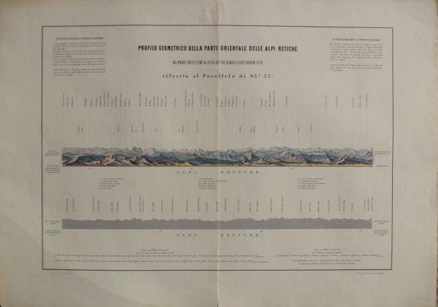 Tratta dall' “Atlante Geografico dell'Italia”, Milano, Francesco Vallardi, 1880 circa. Litografia a doppia pagina (Litografia di Pietro Bertotti), colore d'epoca, cm 46,5 x 67 (la parte figurata) più margini. Tavola raffigurante il profilo geometrico della parte orientale delle Alpi Retiche, con estensione dal Monte Ortles fino al Pizzo dei Tre Signori e in cui si distinguono le vette principali e le secondarie. Buon esemplare.