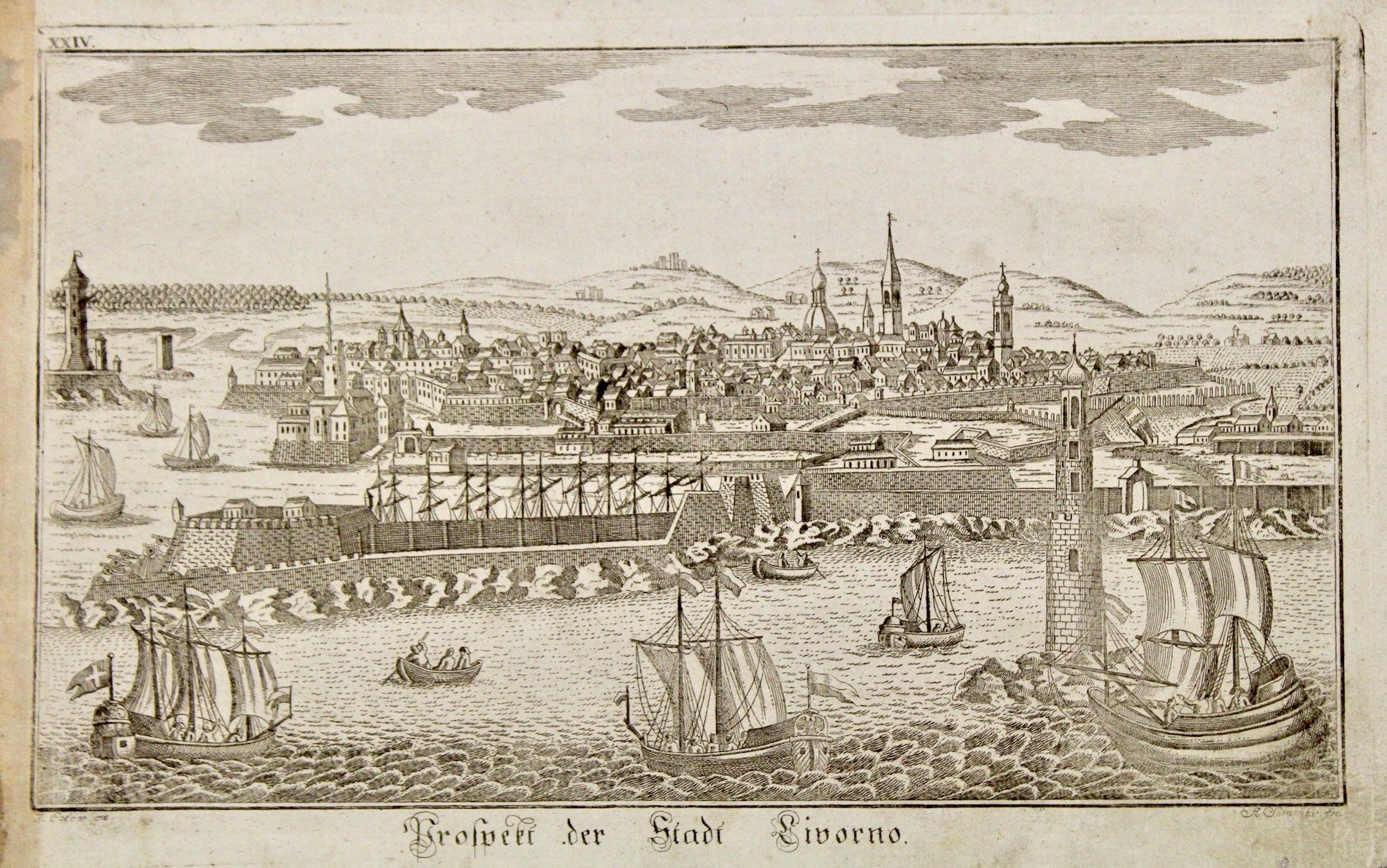 Incisione in rame, 155x263. Non comune veduta generale dal mare eseguita su disegno di J Eder, derivata da Engelbrecht. Ben conservata, margine sinistro con applicazione di una strisciolina di carta usata per rilegare la stampa in album. Frati, Livorno nelle antiche stampe, 70.
