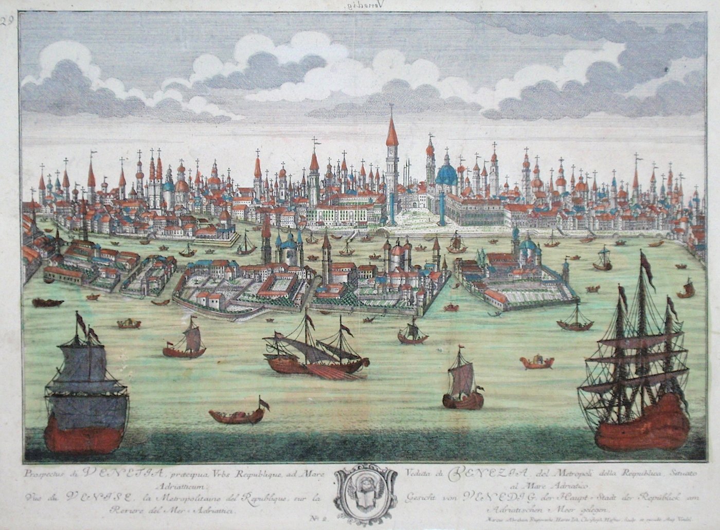 Prospectus di Venetia, praecipua Urbs Reipublique, ad Mare Adriatticum. (titolo ripetuto in italiano, francese e tedesco).