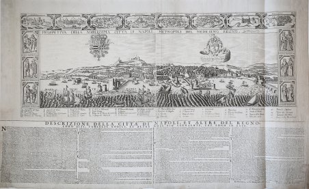 Acquaforte e bulino, circa 1665, firmata in lastra nel cartiglio con la dedica al centro. Edita a Bologna dalla tipografia Longhi. Magnifica prova, impressa su quattro fogli di carta vergata coeva uniti al centro, pieghe di carta e piccoli strappi, per il resto in ottimo stato di conservazione. Giusppe Longhi fu un attivo tipografo ed editore, noto anche per una ricca produzione libraria. Molto famose sono anche le sue grandi vedute di città italiane, disegnate seguendo il modello iconografico dei panorami olandesi dell’inizio del XVII secolo ed integrate da una decorazione figurata tipica della cartografia olandese dei vari Blaeu, Janssonius e Visscher. La veduta di Napoli è contornata ai lati dai costumi tipici dell’epoca e sopra dalle vedute delle principali città del Regno di Napoli: Fondi, Gaeta, Caiazzo, Pozzuoli, Sulmona, Tricarico, Taranto e Gallipoli. Una ricca descrizione della città e dei luoghi notabili è allegata in basso. Giovan Battista Cavazza è pittore ed incisore bolognese, allievo di Guido Reni. La sua opera cartografica più famosa è un mappamondo in proiezione mercatoriana datato 1643. Magnifico esemplare di questa rarissima veduta di Napoli. Bibliografia: Bellucci e Valerio, Piante e Vedute di Napoli dal 1600 al 1669, p. 121, 71. Dimensioni 840x330. Etching and engraving, 1665 circa, signed on plate in the cartouche with the dedication in the centre. Published in Bologna by the Longhi typography. Magnificent work, printed on four sheets of contemporary laid paper joined together in the centre, signs of paper folds and minor tears, otherwise in good condition. Giuseppe Longhi was a prolific typographer and publisher and was also quite famous for the publication of books. His great views of Italian cities are also well renowned; they were drawn following the Dutch model of the beginning of the XVII century and were completed with figure decoration, typical of the Dutch production of Blaeu, Janssonius and Visscher. The view of Naples is decorated on the two sides with the costumes of the time and, on the upper part, with the views of the main cities of the Reign of Naples: Fondi, Gaeta, Caiazzo, Pozzuoli, Sulmona, Tricarico, Taranto and Gallipoli. A detailed description of the city and the noteworthy places have been enclosed on lower part. Giovan Battista Cavazza was a Bolognese painter and engraver, pupil of Guido Reni. His most famous cartographic work is a map of the world in the Mercator projection, 1643. Magnificent example of a rare view of Naples. Bibliografia: Bellucci e Valerio, Piante e Vedute di Napoli dal 1600 al 1669, p. 121, 71. Dimensioni 840x330. Cfr. E. Bellucci - V. Valerio, "Piante e Vedute di Napoli dal 1600 al 1669", p. 121, 71; G. Pane - V. Valerio, "La città di Napoli tra vedutismo e cartografia", p.134