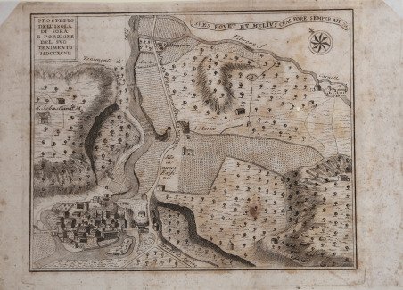 Mappa della città di Isola di Sora, oggi Isola del Liri, inserita nel volume:Descrizione storico-filologica delle antiche, e moderne citta, e castelli, esistenti accosto i fiumi Liri, e Fibreno: arricchita di vetusti monumenti in gran parte inediti, con un saggio delle vite degl'illustri personaggi ivi nati. Dell'ab. Ferdinando Pistilli. - In Napoli : presso Amato Cons, 1798. In questo volume, l'abate Pistilli¹ scrive che progettando di far stabilire una manifattura di ferro filato a Isola di Sora, nel 1793 "il Commissario di Campagna il Sig. Tommaso Oliva, quinci venuto per osservare oculatamente l'eseguibilità delle manifatture, [fece] staccare la pianta dall'ingegnere D. Giuseppe Giordano, giovine di grande aspettativa nella sua professione, il quale disegnolla, e miniolla a vista d'uccello con mano maestra, e con molta soddisfazione del Sovrano, cui venne presentata insieme colla rappresentanza di esso Sig. Oliva".La tavola riporta in altro a destra il motto: "Spes fovet et melius cras fore semper ait", che riprende il v. 20, Elegia VI, Libro II di Albio Tibullo (Gabi oppure Pedum, 54 a.C. ca. - Roma, 19 a.C.), poeta latino tra i massimi esponenti dell'elegia eroica.Incisione in rame, carta leggermente ossidata, per il resto in buono stato di conservazione Mappa della città di Isola di Sora, oggi Isola del Liri, inserita nel volume:Descrizione storico-filologica delle antiche, e moderne citta, e castelli, esistenti accosto i fiumi Liri, e Fibreno: arricchita di vetusti monumenti in gran parte inediti, con un saggio delle vite degl'illustri personaggi ivi nati. Dell'ab. Ferdinando Pistilli. - In Napoli : presso Amato Cons, 1798. In questo volume, l'abate Pistilli¹ scrive che progettando di far stabilire una manifattura di ferro filato a Isola di Sora, nel 1793 "il Commissario di Campagna il Sig. Tommaso Oliva, quinci venuto per osservare oculatamente l'eseguibilità delle manifatture, [fece] staccare la pianta dall'ingegnere D. Giuseppe Giordano, giovine di grande aspettativa nella sua professione, il quale disegnolla, e miniolla a vista d'uccello con mano maestra, e con molta soddisfazione del Sovrano, cui venne presentata insieme colla rappresentanza di esso Sig. Oliva".La tavola riporta in altro a destra il motto: "Spes fovet et melius cras fore semper ait", che riprende il v. 20, Elegia VI, Libro II di Albio Tibullo (Gabi oppure Pedum, 54 a.C. ca. - Roma, 19 a.C.), poeta latino tra i massimi esponenti dell'elegia eroica.Incisione in rame, carta leggermente ossidata, per il resto in buono stato di conservazione Cfr.