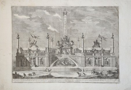Acquaforte e bulino, 1758. Da un soggetto di Paolo Posi.Buona prova, impressa su carta vergata coeva, con margini, leggere abrasioni, per il resto in buone condizioni.Le macchine del fuoco per la festa della Chinea. Chinea in senso letterale, era la mula bianca (o il cavallo ambiatore delle Asturie) che i Re di Spagna presentavano annualmente al papa in forma solenne per il pagamento del censo per il Regno di Napoli. Il cavallo, convenientemente ammaestrato, s'inginocchiava davanti al pontefice e gli offriva la somma di danaro contenuta in un vaso d'argento fissato alla sella. L'offerta era preceduta da una solenne cavalcata della durata di due ore e mezza, lungo un itinerario preciso. Per rendere più solenne la cerimonia, con decreto del 12 maggio 1691 di Carlo II, si obbligavano i “grandi” di Spagna a partecipare al solenne corteo, al quale seguivano per due sere spari di macchine pirotecniche accompagnati da esecuzioni musicali, balli e rinfreschi. La chinea, per la sua regolarità, non era soltanto la festa estiva per eccellenza, ma il migliore biglietto da visita della monarchia spagnola (poi di quella napoletana) nella città eterna, l'arma propagandistica più convincente per guadagnare un consenso universale e l'appoggio politico delle altre potenze. Le celebrazioni erano fastosissime, malgrado i problemi politici della nazione, ed il consueto ritardo nell'invio del danaro per il loro svolgimento. In occasione della festa, palazzo di Spagna e, successivamente, palazzo Colonna e palazzo Farnese, diventavano per due mesi all'anno l'atelier di inventori, pittori, disegnatori e architetti di macchine, nonché il momento di aggregazione di artificieri, fuocaroli, musicisti, fornitori e cuochi. Questi palazzi, inoltre, diventavano, per due giorni all'anno, sede dell'ambasciata straordinaria, luogo dal quale partiva la cavalcata e davanti al quale si innalzavano le « stupefacenti » macchine per i fuochi d'artificio, dove si disponevano le luminarie tenute accese le sere della vigilia e il giorno della festività dei santi Pietro e Paolo. Risale agli inizi del Settecento la consuetudine di allestire, il 28 e 29 giugno, due sontuose macchine in piazza santissimi Apostoli (più raramente in piazza Farnese), di cui conosciamo le caratteristiche grazie alle minuziose incisioni, accompagnate da esaurienti didascalie, che vennero stampate annualmente dal 1723. Monopolizzarono la costruzione e progettazione delle macchine di questo periodo Paolo Posi, architetto camerale della Repubblica di Venezia e di casa Colonna, in collaborazione con il suo allievo, l'architetto camerale Giuseppe Palazzi, e con l'incisore Giuseppe Vasi. Posi, ultimo epigono del barocco, celebrava Ferdinando negli apparati come appassionato archeologo, e come l'entusiasta monarca favorevole al trasporto in piazza di elementi popolari sulla platea d'un sontuoso edificio destinato al divertimento pubblico. Più che mai per tali apparati, ove l'incisore lavorò su disegni altrui, come d'altronde per spettacolari cortei o cavalcate cittadine, il Vasi è prezioso testimone ed interprete del suo tempo. Etching, printed on contemporary laid paper, small abrasions, otherwise in good conditionThe engravings have been laid on canvas and framed; after a long work to repair them, they now look almost perfect. Signs of glue on verso, on recto signs of abrasions and oxidations.Chinea literally means white female mule, the one the Kings of Spain offered every year to the Pope as a solemn payment of the income of the Kingdome of Naples. The horse, duly trained, knelt in front of the Pope and to offer him a silver vase with money inside, that was fastened to its saddle.The offer was preceded by a solemn ride of two and a half hours, a long and precise itinerary. To make it even more solemn, as per Charles II decree of the 12 of May 1691, the Greats of Spain were obliged to take part to the cortege, which was then followed by two series of pyrotechnical shots and music, dances and food. The chinea, due to its reiteration, was not only the most important summer party, but was even the best way for the Spanish monarchy to present itself in Rome, the best promotional campaign to gain universal consent and political support from the other monarchies.The celebration was massive, notwithstanding the political problems and the late remittance to pay it. When the celebration was organized, and even after that, Palazzo Colonna and Palazzo Farnese became for two months the workshops for inventors, painters, drawers, architects and even pyrotechnists, musicians, suppliers and cooks. These Palazzi became also, for two days, the extraordinary embassy, the starting point of the solemn ride and in front of which the “fabulous” pyrotechnical machines shot their fireworks, where all the light were lightened on the eve and the very day of the celebration of St. Peter and St. Paul. The tradition of building the fireworks machines in the square of Santissimi Apostoli, on the 28 and the 29 of June, was started in the XVIII century (just sometimes in piazza Farnese); all we know about this habit derives from the detailed engravings and the texts that have been printed yearly, starting from 1723.Paolo Posi, architect of the Venetian Republic and of the Colonna Family, and his scholar Giuseppe Palazzi, together with Giuseppe Vasi, literally monopolized the art of building these machines. Posi, the last baroque artist, celebrated King Ferdinando in his creations and the King was absolutely enthusiastic about offering this public spectacular performance.Vasi was, on the other side, an important witness and interpreter of his own time. The set of engravings we present here comes from a Roman collection.The bibliography mentions 45 different works of Vasi dedicates to the pyrotechnical machines. Cfr.