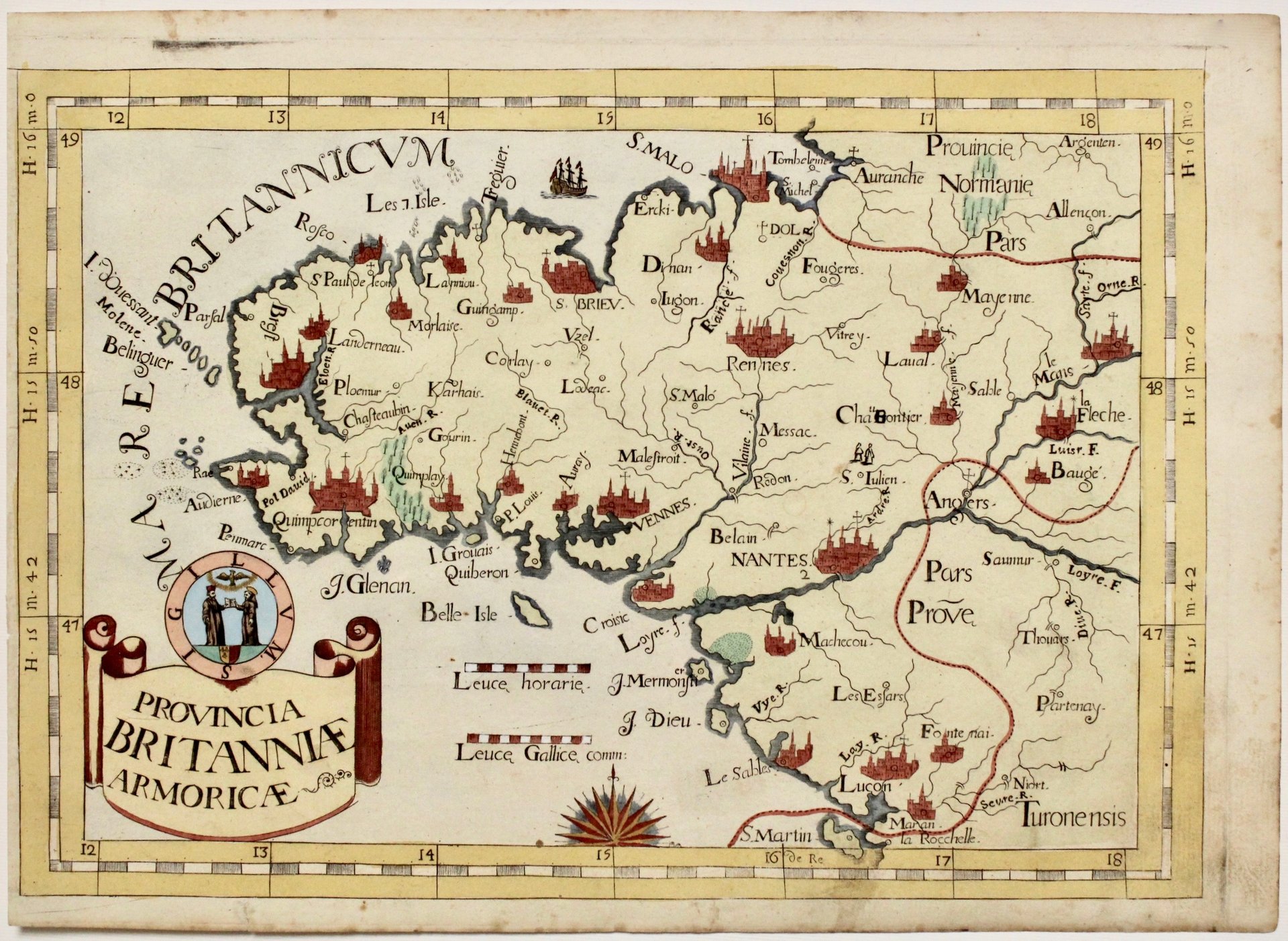 Incisione in rame, mm 225x320, dipinta a mano. Carta dallo stile unico non paragonabile a nessuna altra carta dello stesso periodo. Non comune carta della Bretagna che raffigura tutti i conventi dei Padri Cappuccini, pubblicata in “Chorographica descriptio Provinciarum et Conventum minorum S. Francisci Capucinorum” atlante delle province cappuccine, edito per la prima volta nel 1643 a Roma, per volontà di Giovanni da Moncalieri, ministro generale dell’ordine dei Cappuccini ed aggiornato con carte inedite da Giovanni Battista da Cassino nella nuova edizione pubblicata a Milano nel 1712. Ottimo esemplare col margine bianco sinistro un po’ corto. Piccolo strappetto al margine inferiore.