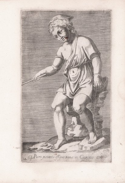Opera tratta dall’Antiquarum statuarum urbis Romae…Io. Baptista de Cavalleris authore, la prima raccolta sistematica di illustrazioni di sculture antiche conservate nelle collezioni romane, che si deve all’opera dell’incisore e disegnatore Giovanni Battista Cavalieri (1525 circa - 1601) nella seconda metà del XVI secolo. Il repertorio, punto di riferimento per gli studi antiquari, conobbe grande diffusione e contribuì ad orientare l'interesse degli studiosi dell'epoca verso la statuaria antica. Il numero delle tavole, circa 50 nelle prime edizioni (databili circa al 1561/62) venne ampliato successivamente; prima del 1584 furono pubblicati i libri I e II con 100 incisioni numerate di sculture, organizzate per collezioni di appartenenza. Nel 1594 videro la luce il III e IV volume dell’opera, in cui comparvero altre 100 nuove tavole, stavolta ordinate in base all’iconografia dei soggetti. Le sculture sono raffigurate su sfondi neutri, privi di riferimenti architettonici. L’opera, con il titolo ' Antiquarum statuarum Urbis Romae primus, ' senza data, venne dedicata prima a Ottone Truchsess von Walburg – prima in qualità di diacono di S. Maria in Trastevere (1561/62) e poi di cardinale di Albano (1562/70). In seguito, con il titolo ' Antiquarum statuarum Urbis Romae primus et secundus liber ' il frontespizio reca la dedica al cardinale Ludovico Madruzzo, ed è databile al 1584/85. Nel 1594, con il titolo ' Antiquarum Statuarum Urbis Romae tertius et quartus liber, escono cento nuove tavole con dedica al cardinale G. Paluzzi degli Albertoni, del giugno 1593. Si tenga presente che, mentre nei primi due libri le statue erano pubblicate secondo le collezioni, nel terzo e quarto sono raggruppate per soggetto. La raccolta contiene, oltre alle incisioni di Giovanni Battista Cavalieri alcune tavole firmate da Cherubino Alberti, Orazio de Santis e altri famosi incisori dell’epoca. Giovanni Battista de Cavalieri o Cavalleris fu incisore, stampatore e editore. Originario di Villa Lagarina, nei pressi di Trento, risulta attivo a Venezia (dal 1559) e a Roma, dove nel 1577 apri una bottega nel quartiere Parione. Risiedeva nel vicolo di Palazzo Savelli, con uno studio vicino all’abitazione. Divenne cognato del celebre editore Lorenzo Vaccari. Realizzo lastre per Antonio Salamanca, Antonio Lafreri e Bartolomeo Faleti. Iniziò a pubblicare le sue opere intorno al 1560, ma sempre in partnership con altri: nel 1567 con Perino Zecchini e nel 1576 con Lorenzo Vaccari. Nel 1577 assunse uno stampatore, Francesco Cornuti, pubblicando opere di suoi contemporanei, tra cui Francesco Salviati, Daniele da Volterra, Raffaello, Michelangelo, Polidoro da Caravaggio, Livio Agresti e Baccio Bandinelli. ' Bulino, stampato su carta vergata coeva, in ottimo stato di conservazione. Bibliografia Thomas Ashby, ' Antiquae Statuae urbis Romae, in ' Papers of the British School at Rome, IX (1920), pp. 109-158; S. Weber, ' Artisti trentini ed artisti che operarono nel Trentino, Trento 1933, pp. 72 ss. Plate taken from the ' Antiquarum statuarum urbis Romae.Io. Baptista de Cavalleris authore, ' the first systematic collection of illustrations of ancient sculptures preserved in Roman collections, which is due to the work of the engraver and draftsman Giovanni Battista Cavalieri (1525 circa - 1601) in the second half of the 16th century. The repertory, a point of reference for antiquarian studies, was widely circulated and contributed to direct the interest of scholars of the time towards ancient statuary. The number of plates, about 50 in the first editions (datable to about 1561/62) was subsequently enlarged; before 1584 books I and II were published with 100 numbered engravings of sculptures, organized according to the collections they belonged to. In 1594 come to the light of the III and IV volume of the work, in which appeared other 100 new tables, this time ordered according to the iconography of the subjects. The sculptures are depicted on neutral backgrounds, without architectural references. The work, with the title ' Antiquarum statuarum Urbis Romae primus, ' undated, was first dedicated to Ottone Truchsess von Walburg - first as deacon of S. Maria in Trastevere (1561/62) and then as cardinal of Albano (1562/70). Later, with the title ' Antiquarum statuarum Urbis Romae primus et secundus liber, ' the frontispiece is dedicated to Cardinal Ludovico Madruzzo, and can be dated 1584/85. In 1594, with the title ' Antiquarum Statuarum Urbis Romae tertius et quartus liber, ' one hundred new plates were published with a dedication to Cardinal G. Paluzzi degli Albertoni, dated June 1593. Please note that, while in the first two books the statues were published according to collections, in the third and fourth are grouped by subject. The collection contains, in addition to the engravings of Giovanni Battista Cavalieri some plates signed by Cherubino Alberti, Orazio de Santis and other famous engravers of the time. Giovanni Battista de Cavalieri or Cavalleris was an engraver, printer and publisher. Born in Villa Lagarina, near Trento, is active in Venice (since 1559) and Rome, where in 1577 opened a workshop in the Parione district. He resided in the alley of Palazzo Savelli, with a studio near the house. He became brother-in-law of the famous publisher Lorenzo Vaccari. He made plates for Antonio Salamanca, Antonio Lafreri and Bartolomeo Faleti. He began to publish his works around 1560, but always in partnership with others: in 1567 with Perino Zecchini and in 1576 with Lorenzo Vaccari. In 1577 he hired a printer, Francesco Cornuti, publishing works by his contemporaries, including Francesco Salviati, Daniele da Volterra, Raphael, Michelangelo, Polidoro da Caravaggio, Livio Agresti and Baccio Bandinelli. Engraving, printed on contemporary laid paper, in excellent condition. Bibliografia Thomas Ashby, ' Antiquae Statuae urbis Romae, in ' Papers of the British School at Rome, IX (1920), pp. 109-158; S. Weber, ' Artisti