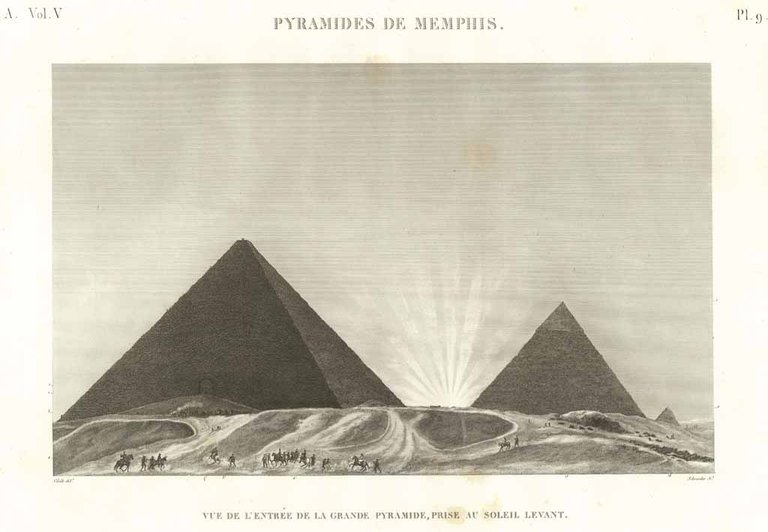 Pyramides de Memphis - Vue de l'entrée de la grande pyramide, prise au soleil levant