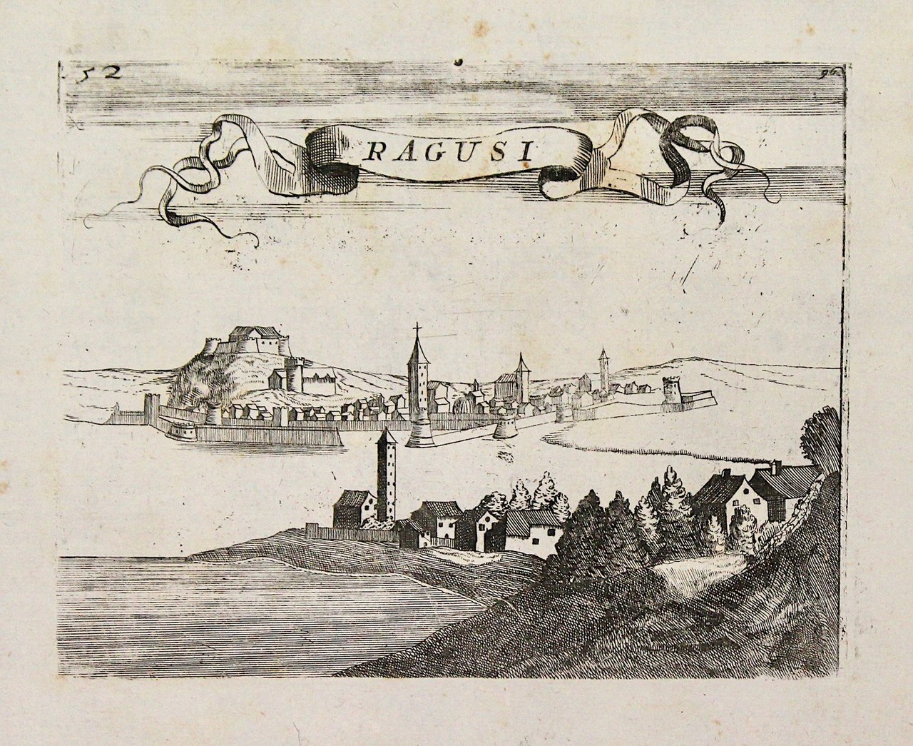 Incisione in rame, mm 127x164<BR>Rara veduta della città tratta da "Teatro della Guerra. Repubblica di Venezia. Tomo III Dalmazia" opera che Armao, massimo studioso di Coronelli reputa rarissima. Perfetto stato di conservazione. <BR>Armao, "Vincenzo Coronelli, cenni sull'uomo e la sua vita", pag. 160: "I volumi della collezione, specie i primi quattro sono rarissimi".
