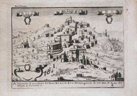 Veduta della città tratta da Il Regno di Napoli in prospettiva diviso in dodeci provincie, in cui si descrivono la sua metropoli fidelissima città di Napoli… Opera postuma divisa in tre parti dell'abate Gio. Battista Pacichelli parte prima [terza]. - In Napoli: nella stamperia di Michele Luigi Mutio, 1700 - 1703. Questa monumentale opera dell'abate Pacichelli si propone di raccontare la storia politico-militare, religiosa, urbanistica, economica ed artistica di 148 città e degli annessi territori, nelle 12 provincie costituenti quello che fu un tempo il Regno di Napoli. Di ogni singolo comune vengono narrate le origini, la situazione economica, le vicende storiche, la topografia e i monumenti, le opere letterarie, i culti e le reliquie dei Santi venerati. Valore aggiunto e parte integrante dei volumi di Pacichelli sono le nitide incisioni che ritraggono tutti i centri del regno napoletano realizzate da Michele Luigi Muzio e le carte geografiche opera di Francesco Cassiano De Silva. L'opera fu consegnata agli editori nel 1692, ma andò in stampa solo dopo la morte di Pacichelli (1695). ' Incisione in rame, leggera gora di umidità, nel complesso in ottimo stato di conservazione. Rara. View of the city taken from Il Regno di Napoli in prospettiva diviso in dodeci provincie, in cui si descrivono la sua metropoli fidelissima città di Napoli. Opera postuma divisa in tre parti dell'abate Gio. Battista Pacichelli parte prima [terza . - In Naples: in the printing house of Michele Luigi Mutio, 1700-1703. This monumental work by Abbot Pacichelli sets out to recount the political-military, religious, urban, economic and artistic history of 148 cities and their annexed territories, in the 12 provinces that made up what was once the Kingdom of Naples. The origins, economic situation, historical events, topography and monuments, literary works, cults and relics of the saints venerated are described for each individual municipality. An added value and an integral part of Pacichelli's volumes are the sharp engravings depicting all the centres of the Neapolitan kingdom by Michele Luigi Muzio and the maps by Francesco Cassiano De Silva. The work was delivered to the publishers in 1692, but only went into print after Pacichelli's death (1695). ' Copperplate, slight humidity marks, overall in excellent condition. Rare. Cfr.