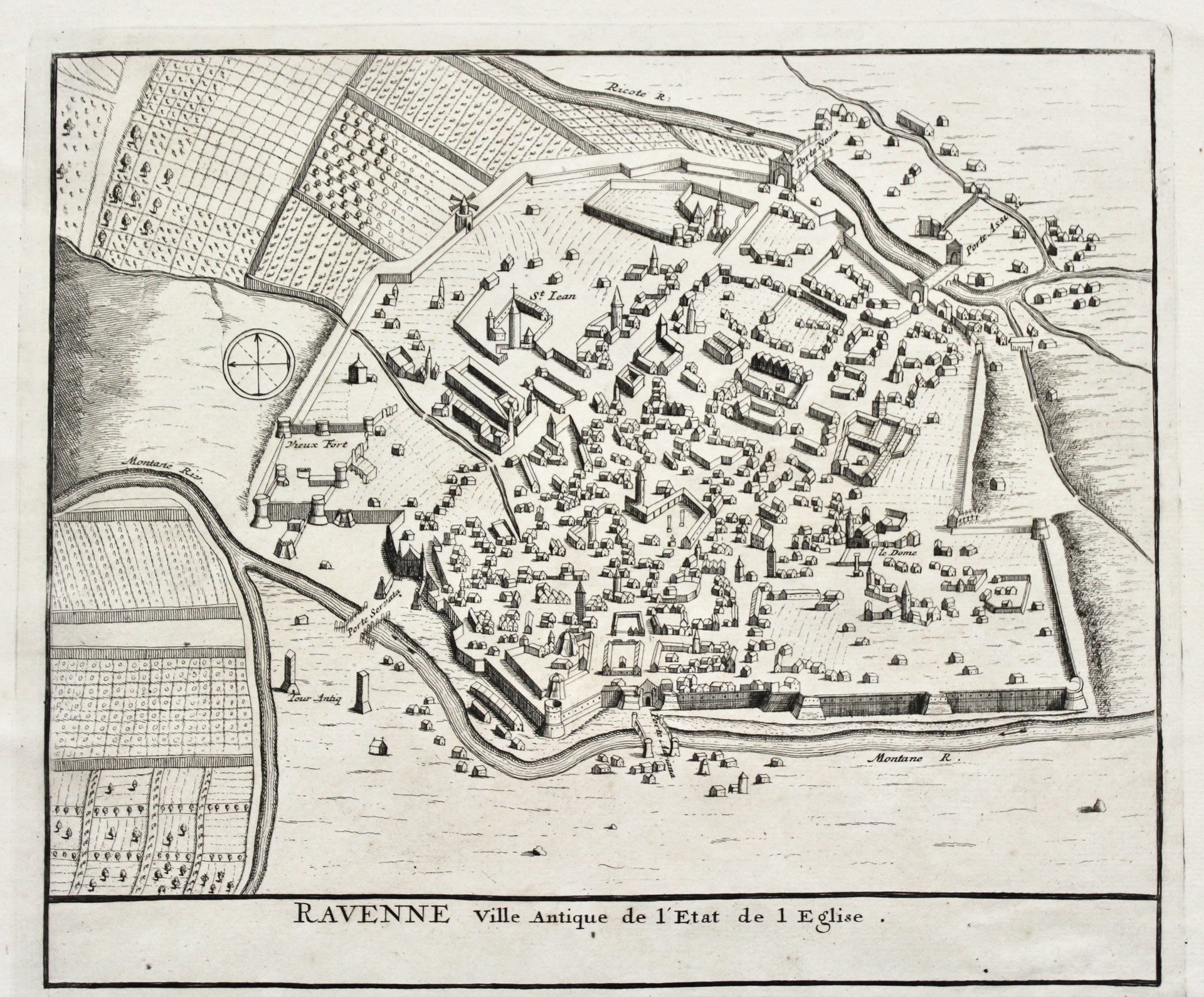 Incisione in rame, mm 212x252. Bella veduta prospettica di Ravenna. Tratta da “Nouveau théâtre d'Italie”. Mortier, editore attivo ad Amsterdam ad inizio secolo, ristampò il “Theatrum Civitatum…Italiae” di Blaeu del 1663 aggiungendovi un quarto volume, relativo a nord Italia e Toscana. Allo stesso modo, Alberts apportò modifiche e inserì la sua impronta su molte mappe. Ottimo esemplare ben inchiostrato, stampato su carta forte.