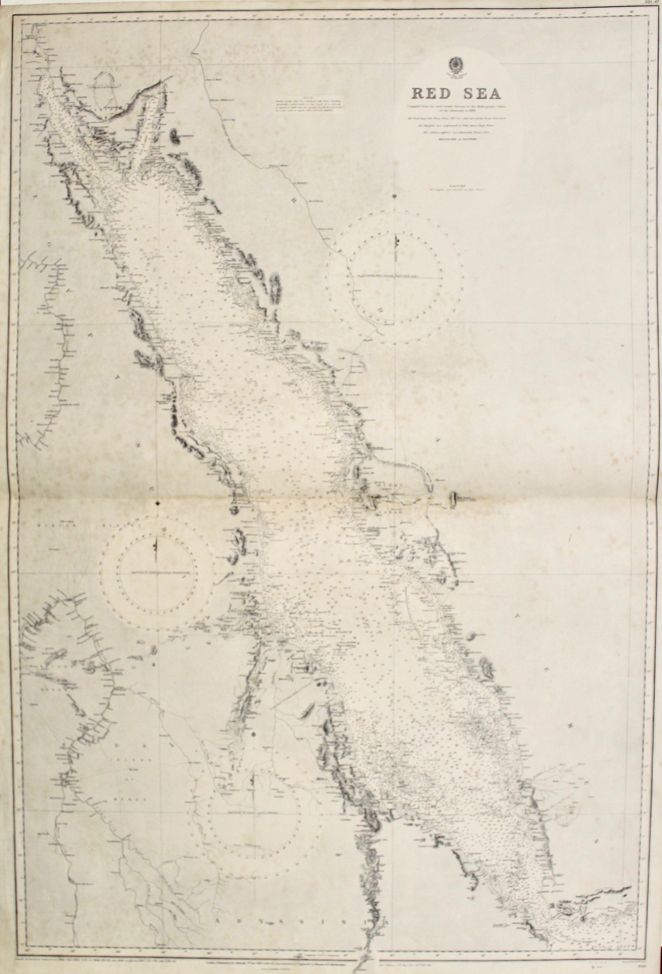 Incisione di Edward Weller, mm 987x660. Grande carta del Mar Rosso, di notevole dettaglio. Ben conservata