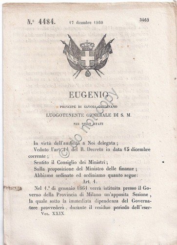 Regio Decreto 1860 Eugenio Bilancio speciale in Lombardia n.4484 | Grabados |