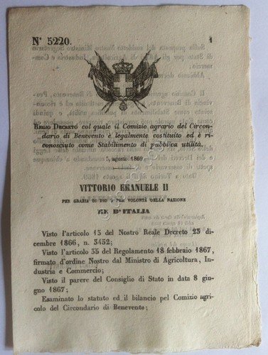 Regio Decreto 5220 Benevento Stabilimento di pubblica utilità | Grabados |