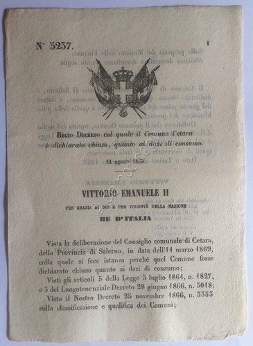 Regio Decreto 5237 - Comune di Cetara chiuso quanto ai dazi di consumo - 1869