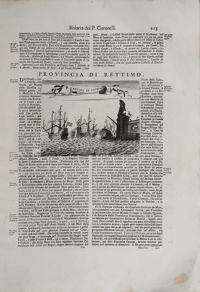 Opera tratta dall’Isolario dell’Atlante Veneto del P. Coronelli, In Venetia MDCXCVI. Coronelli visse un periodo di straordinaria fecondità editoriale a partire dal 1689, quando ebbe la cattedra di geografia presso l'Università alle Procuratie, con la pubblicazione, nel 1690, del primo volume dell'Atlante Veneto. In effetti sotto il nome di ' Atlante Veneto ' va tutta la raccolta di tredici opere composte nell'arco del decennio successivo, dall'Isolario ' allo ' Specchio del mare. L'Isolario ' mira, con una barocca e minuziosa ricerca del dettaglio, alla celebrazione dei possedimenti della Serenissima. Monumentale raccolta di carte e vedute di isole, rappresenta l'ultimo degli “isolari” concepiti, che, tra la fine del XVII e l'inizio del XVIII secolo, vennero progressivamente soppiantati dagli atlanti di moderna concezione, opere a stampa caratterizzate da crescente precisione scientifica e da sempre minore pregio artistico. Sulla scia delle nuove conquiste coloniali le rappresentazioni cartografiche vennero ad assumere un carattere sempre più tecnico, fino ad allora piuttosto arbitrario. Incisione in rame posta nella parte superiore del foglio che contiene il testo descrittivo, in ottimo stato di conservazione. The map is taken from ' Isolario dell’Atlante Veneto del P. Coronelli, In Venetia MDCXCVI. Coronelli lived a period of extraordinary editorial fecundity starting from 1689, when he had the chair of geography at the University at the Procuratie, with the publication, in 1690, of the first volume of the ' Atlante Veneto. Under the name of ' Atlante Veneto ' goes the entire collection of thirteen works composed over the next decade, from the ' Isolario ' to the ' Specchio del mare. The ' Isolario ' aims, with a baroque and meticulous search for detail, to celebrate the possessions of the Serenissima. Monumental collection of maps and views of islands, represents the last of the "isolarios" conceived, which, between the end of the seventeenth and the beginning of the eighteenth century, were gradually supplanted by modern atlases, printed works characterized by increasing scientific precision and less and less artistic value. In the wake of the new colonial conquests, cartographic representations came to assume an increasingly technical character, until then rather arbitrary. Copperplate in very good conditions. Set in a page of text. Cfr.