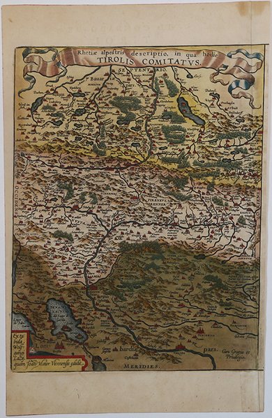 Mappa del Tirolo che si estende da Mantova, Verona e Vincenza a Furstenfeld, Mildorf e Wasserburg e si concentra su Innsburck. Nella Mappa troviamo anche Salisburgo.Tratta dall'edizione francese del 1587 del Theatrum Orbis Terrarum ' e che è considerato il primo vero “atlante” moderno. L’opera fu pubblicata in 7 lingue e 36 edizioni, per il quale – nel 1570 - Ortelius ottenne il ' privilegio, ovvero una sorta di diritto d'autore che impediva ad altri cartografi di pubblicare i propri lavori. Il ' Theatrum ' rappresentava il lavoro più avanzato del lavoro della descrizione cartografica. L’Ortelius vi raccolse il sapere geografico e cartografico del suo tempo, proponendo in 147 spettacolari tavole incise l’immagine più fedele del mondo allora conosciuto e, in alcune straordinarie “carte storiche”, regioni e itinerari tratti dalla letteratura, dalla mitologia, dalla tradizione. Ortelius fu anche il primo a citare le fonti, menzionando i nomi dei cartografi nel “catalogus auctorum”. Dal 1598 al 1612 le edizioni postume del ' Theatrum ' furono realizzate dal suo collaboratore Johannes Baptiste Vrients. Incisione in rame, eccellente coloritura coeva, in ottimo stato di conservazione. The Tirolian map extends from Mantua, Verona and Vincenza to Furstenfeld, Mildorf and Wasserburg and is centered on Innsburck. Salzburg also appears. From the 1587 French edition of Ortelius' Theatrum Orbis Terrarum, which is considered the first true modern "Atlas". The work was published in 7 languages and 36 editions, for which - in 1570 - Ortelius obtained the privilege, a kind of copyright that prevented other cartographers from publishing his works. The ' Theatrum ' represented the most advanced work of cartographic description. Ortelius collected in it the geographical and cartographic knowledge of his time, proposing in 147 spectacular engraved plates the most faithful image of the world then known and, in some extraordinary "historical maps", regions and routes taken from literature, mythology, tradition. Ortelius was also the first to cite sources, mentioning the names of cartographers in the "catalogus auctorum". From 1598 to 1612 the posthumous editions of the ' Theatrum ' were made by his collaborator Johannes Baptiste Vrients. Copper engraving, contemporary coloring, in good condition. Cfr. Van Den Broecke, 116.