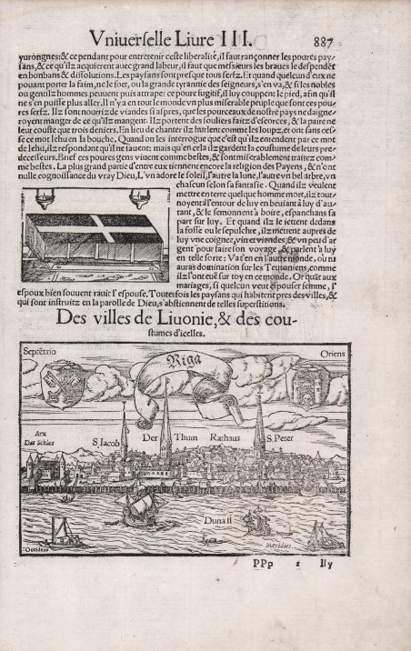 Carta geografica tratta dalla ' Cosmographiae Universalis, edizione in francese, stampata con il titolo di La cosmographie universelle, contenant la situation de toutes les parties du monde a Basilea, nel 1552 (prima edizione in lingua francese). La ' Cosmographiae Universalis ' di Sebastian Münster (1488-1552), stampata per la prima volta Basilea nel 1544 dall’editore Heinrich Petri, venne più volte aggiornata e aumentata di nuove carte geografiche e rappresentazioni urbane nelle sue numerose edizioni che arrivano all’inizio del secolo successivo. Münster aveva lavorato a raccogliere informazioni al fine di ottenere un'opera che non deludesse le aspettative e, dopo un'ulteriore pubblicazione in tedesco abbellita da 910 stampe su legno, giunse nel 1550 all'edizione definitiva in latino, illustrata da 970 silografie. Vi furono poi numerose edizioni in diverse lingue, fra cui latino, francese, italiano, inglese e ceco. Dopo la sua morte di Münster (1552), Heinrich Petri prima, e il figlio Sebastian poi, continuarono la pubblicazione dell’opera. La ' Cosmographia universalis ' fu uno dei libri più popolari e di successo del XVI secolo, e vide ben 24 edizioni in 100 anni: l'ultima edizione tedesca venne pubblicata nel 1628, molto tempo dopo la morte dell'autore. La ' Cosmographia ' conteneva non solo le ultime mappe e vedute di tutte le città più famose, ma anche una serie di notizie enciclopediche di dettagli relative al mondo conosciuto, e sconosciuto. Il particolare successo anche commerciale di quest'opera fu dovuto in parte alle belle incisioni (tra i cui autori si possono citate Hans Holbein il Giovane, Urs Graf, Hans Rudolph Manuel Deutsch, David Kandel). Silografia, in buone condizioni. Plate taken from the ' Cosmographiae Universalis, Frenche edition, published with the title La cosmographie universelle, contenant la situation de toutes les parties du monde Basel, 1552 [first French edition]. The ' Cosmographiae Universalis ' of Sebastian Münster (1488-1552), printed for the first time in Basel in 1544 by the publisher Heinrich Petri, was updated several times and increased with new maps and urban representations in its many editions until the beginning of the next century. Münster had worked to collect information in order to obtain a work that did not disappoint expectations and, after a further publication in German embellished with 910 woodblock prints, arrived in 1550 to the final edition in Latin, illustrated by 970 woodcuts. There were then numerous editions in different languages, including Latin, French, Italian, English and Czech. After his death in Münster (1552), Heinrich Petri first, and then his son Sebastian, continued the publication of the work. The ' Cosmographia universalis ' was one of the most popular and successful books of the 16th century, and saw as many as 24 editions in 100 years: the last German edition was published in 1628, long after the author's death. The ' Cosmographia ' contained not only the latest maps and views of all the most famous cities, but also a series of encyclopedic details related to the known, and unknown, world. The particular commercial success of this work was due in part to the beautiful engravings (among whose authors can be mentioned Hans Holbein the Younger, Urs Graf, Hans Rudolph Manuel Deutsch, David Kandel). Woodcut, in good condition. Cfr.