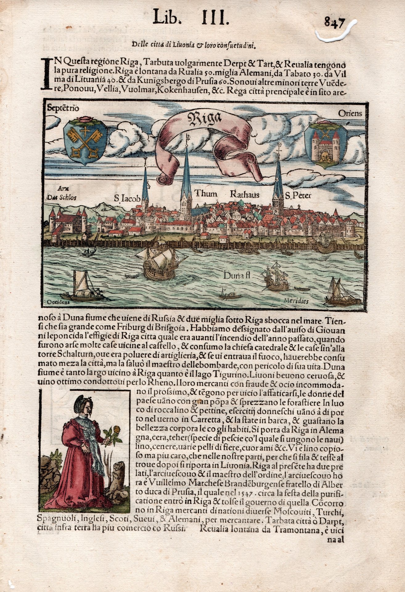 Incisione in legno, mm 100x155 su foglio con testo mm 210x313, dipinta a mano. Testo italiano. E' questa la prima raffigurazione della città, precedente al grande incendio che la distrusse nel 1547. L'incisione è tratta da "Cosmographia universale", una delle prime descrizioni del mondo intero e la più importante opera geografica tedesca dopo la Cronaca di Norimberga del 1493, e venne inserita in tutte le edizioni dal 1744 al 1628. Buon esemplare dalla rara edizione italiana, presumibilmente del 1558.<BR>Woodcut, mm 100x155 on a sheet of mm 210x313, hand colour. From an italian edition of "Cosmographia universalis", one of the most famous geographical-historical works after the "Liber Chonicarum". Good condition with some minor defects <BR>