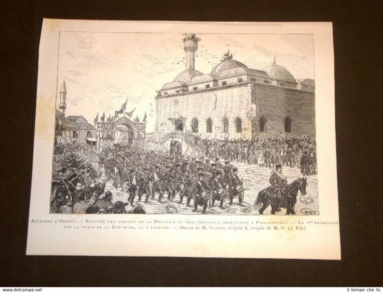 Splendida e rara Incisione Estratta da Rivista d'Epoca di fine '800 Ritorno delle truppe di Bulgaria a Filippopoli o Plovdiv Piazza della Djoumaia MI1886-013T Dimensioni Cm 23,00 x 19,00 Qualora vogliate delle scansioni migliori contattateci, soddisferemo ogni vostra richiesta. Paypal Carta di credito Bonifico bancario Accuratamente adagiate su un cartoncino e protette da pellicola trasparente rigida il tutto viene inserito dentro plico di adeguate dimensioni per proteggerne l'integrità