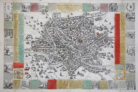 Pianta archeologica di Roma incisa da Giacomo Lauro e pubblicata dalla tipografia de Rossi.In alto al centro il titolo e l’imprint editoriale ROMA ANTIQUA TRIUMPHATRIX AB ANTIQUIS MONUMENTIS ET RERUM GESTARUM MEMORIIS ERUTA HICA IACOBO LAURO ROMANO AUCTORE ET SCULPTORE GRAPHICE EXPRESSA. Io. Iacobus de Rubeis formis Romae ad Templu[m] Pacis cu[m] Priv. S. Pont. In basso al centro Romae Cum Privilegio Summi Pontificis. A destra e sinistra della carta una lunga legenda numerica di 279 rimandi a luoghi e monumenti notabili e due piccole mappe. La carta è circondata da un testo inciso e da venti vignette che simboleggiano momenti significativi nella storia antica della città. Carta priva di orientazione. Acquaforte e bulino, mm 482x736.La carta è circondata da un testo inciso e da venti vignette che simboleggiano momenti significativi nella storia antica della città, mentre due piccole mappe raffigurano i sette colli sui quali sorge Roma. Incerta è la datazione della stessa, che il Frutaz colloca tra il 1612 e prima del 1650. Cartograficamente ispirata a quella realizzata da Etienne Duperac nel 1574, la pianta venne pubblicata da Giacomo de Rossi tra il 1649 e il 1677, anno in cui viene elencata nel celebre Indice della stamperia De Rossi.Acquaforte e bulino, impressa su carta vergata coeva, con margini, ' ' colori coevi, lieve restauro con parziale perdita di testo in basso al centro, nel complesso in eccellente stato di conservazione.BibliografiaArrigoni-Bertarelli (1930): p. 10, n. 77; Christie’s (1998): n. 1034; Frutaz (1962): p. 72, n. XXVII, Tavv. 59-61; Hülsen (1915): XXIII, p. 86, n. 107; Iusco. Indice delle stampe de' Rossi, p. 379 (p.16 c.2); Scaccia Scarafoni (1939): pp. 32-33, n. 32. The bird's-eye view of ancient Rome by Giacomo Lauro was derived from Etienne du Pe?rac's large view of Rome.Printed from two separate plates on two sheets subsequently joined at vertical edges. List of buildings and sites numbered 1-279, keyed to view. At outer margin is a band of 16 engraved scenes from Roman history interspersed with 20 numbered explanatory texts. Heads of the 7 kings of Rome appear at upper left, heads of the 12 Caesars at upper right. Title and imprint at top center. Oriented with east at top.In marginal text, Lauro refers to his Antiquae urbis splendor (published 1612), so the view must have been engraved between that date and his death in 1650. This span is narrowed by the probability that the present view is that signed by Lauro in 1635. It must have been published by Giovanni Giacomo de Rossi between the beginning of his publishing activity in 1649 and the 1677 index of his publications whichincludes this view.Etching with engraving, printed on contemporary laid paper, with margins, ' ' contemporary colour, light repair with the loss of part of the text on lower part, otherwise in excellent condition.LiteratureArrigoni-Bertarelli (1930): p. 10, n. 77; Christie’s (1998): n. 1034; Frutaz (1962): p. 72, n. XXVII, Tavv. 59-61; Hülsen (1915): XXIII, p. 86, n. 107; Iusco. Indice delle stampe de' Rossi, p. 379 (p.16 c.2); Scaccia Scarafoni (1939): pp. 32-33, n. 32. Cfr.