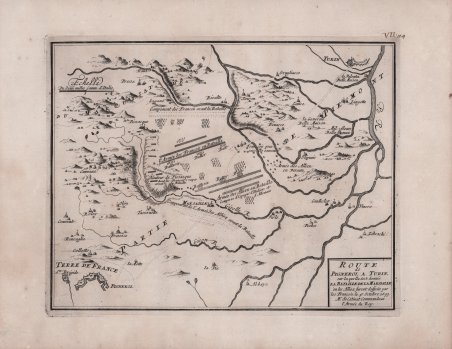 Carta geografica tratta da ' Les forces de l’Europe ou description des principals villes… ' Paris: Chez l'Auteur, 1693-1696 ' celebre raccolta composta da otto parti in un volume, in folio oblungo. Les Forces de l’Europe ' è un noto atlante militare francese; prevalentemente si tratta di mappe, piani e vedute di fortificazioni di città europee in Francia, Germania e Paesi Bassi, l'atlante include anche una serie di altre regioni, tra cui Malta, Costantinopoli, Tripoli e altrove. Nicolas de Fer (1646-1720) è stato uno dei più grandi cartografi, incisori ed editori del XVII secolo. Il padre, Antoine de Fer, era un modesto mercante di stampe che lavorava sull’Ile del la Cité a Parigi; collaborò con Nicolas I Berey, poi con Melchior Tavernier e, quindi, con Jacques Lagnet. Nel 1652 Antoine adotta l’insegna commerciale della “Sphére royale”, già appartenuta a Tavernier; nel 1657 stampa ' Cartes de géographie, una piccola raccolta tascabile di Pierre Duval. Nel 1667 si firmava “merchand de cartes Gèographique”; proseguì l’attività fino al 1686, quando lasciò la tipografia nelle mani del figlio Nicolas, che aveva fatto da apprendista all’incisore parigino Louis Spirinx e aveva già realizzato la sua prima mappa del Canal du Midi, all’età di soli 23 anni. Nel 1689 realizzò una mappa della Franche-Comté per onorare il Grand Dauphine - Luigi di Francia (1661-1711), primogenito ed erede del re Luigi XIV di Francia, impegnato al comando di una campagna di conquistare di nuovi territori sul Reno. In seguito, venne nominato geografo ufficiale del Delfinato e la sua produzione fu strettamente legata agli interessi della corona francese: ad esempio, ' Forces De L’Europe Ou Introduction A La Fortification, pubblicato nel 1695, che mostrava le nuove fortificazioni progettate dall’innovativo ingegnere francese Sébastien de Vauban. Fu il geografo ufficiale anche di Filippo V e Luigi XIV (entrambi i rami francese e spagnolo della Casa di Borbone) e infine, nel 1720, del Papa. De Fer pubblicò l’Atlas curieux où le Monde représenté dans les cartes générales et particulièrs du Ciel et de ' la Terre ' tra il 1700 e il 1705, aggiungendo ogni volta delle nuove tavole geografiche. La sua opera più maestosa rimane l’Atlas Royal, dans l’Isle du Palais sur le Quay de l'Orloge a la Sphere royale ' (1693). Alla sua morte, l’attività fu ereditata da suo genero Guillaume Danet, che si unì poi con Jacques-François Benard. Acquaforte, in buono stato di conservazione. Map from ' Les forces de l'Europe ou description des principals villes ' . Paris: Chez l'Auteur, 1693-1696 ' famous collection consisting of eight parts in one volume, oblong folio. Les Forces de l'Europe ' is a well-known French military atlas; predominantly maps, plans and views of fortifications of European cities in France, Germany and the Netherlands, the atlas also includes a number of other regions, including Malta, Constantinople, Tripoli and elsewhere. Nicolas de Fer (1646-1720) was one of the greatest cartographers, engravers and publishers of the 17th century. His father, Antoine de Fer, was a modest print merchant working on the Ile del la Cité in Paris; he collaborated with Nicolas I Berey, then with Melchior Tavernier, and then with Jacques Lagnet. In 1652 Antoine adopted the "Sphére royale" trade sign, which had already belonged to Tavernier; in 1657 he printed ' Cartes de géographie, a small pocket collection by Pierre Duval. In 1667 he signed himself "merchand de cartes Gèographique"; he continued the business until 1686, when he left the print shop in the hands of his son Nicolas, who had been apprenticed to Parisian engraver Louis Spirinx and had already made his first map of the Canal du Midi, at the age of only 23. In 1689 he made a map of Franche-Comté to honor the Grand Dauphine - Louis of France (1661-1711), eldest son and heir of King Louis XIV of France, who was engaged in commanding a campaign to conquer new territories on the Rhine. He was later appointed official geographer of the Dauphiné, and his output was closely linked to the interests of the French crown: for example, ' Forces De L'Europe Ou Introduction A La Fortification, published in 1695, which showed the new fortifications designed by the innovative French engineer Sébastien de Vauban. He was also the official geographer of Philip V and Louis XIV (both the French and Spanish branches of the House of Bourbon) and finally, in 1720, of the Pope. De Fer published theAtlas curieux où le Monde représenté dans les cartes générales et particulièrs du Ciel et de la Terre ' between 1700 and 1705, adding new geographical plates each time. His most majestic work remains the ' Atlas Royal, dans l'Isle du Palais sur le Quay de l'Orloge a la Sphere royale ' (1693). Upon his death, the business was inherited by his son-in-law Guillaume Danet, who later joined forces with Jacques-François Benard. Etching, very good condition. Cfr.