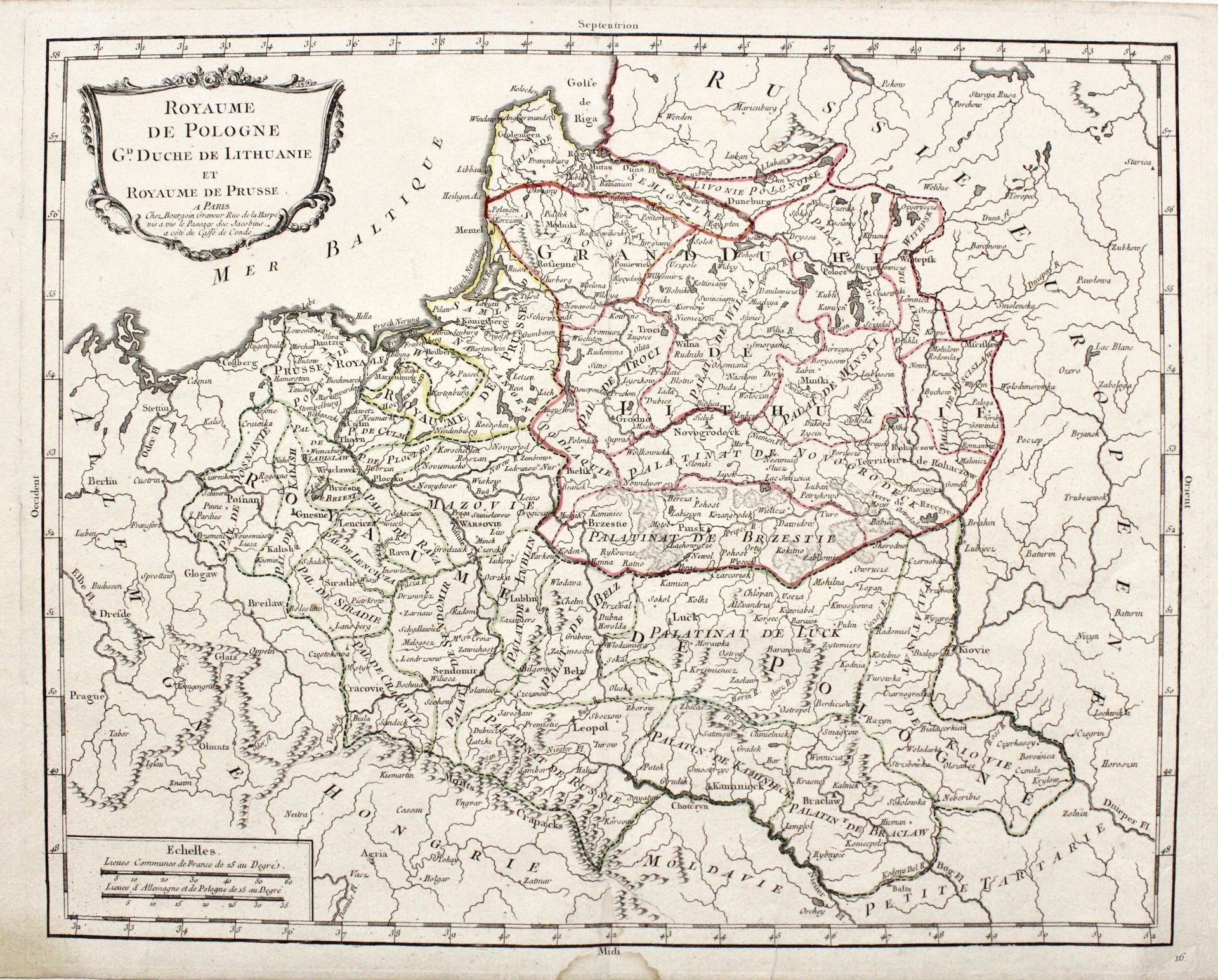 Incisione in rame dipinta coeva ai confini; mm 348x430. La carta è suddivisa in Palatinati e comprende dettagli topografici, città, fiumi, laghi, ecc. Secondo Niewodniczanski, questa carta è apparsa per la prima volta nell'edizione del 1765 dell'Atlas Elementaire de la Geographie, con l'indirizzo Chez Bourgoin Gaveur Rue de la Harpe vis a vis le Passage des Jacobins, a cote du Caffe de Conde, ed è stata poi ripubblicata nel 1784 nello stesso atlante, con un indirizzo diverso per Bourgoin e senza il numero 16 in basso a destra. Buon esemplare, un piccolo alone alla piega centrale del margine inferiore che non entra in lastra. Rara carta del Regno di Polonia e del Ducato di Lituania, pubblicata da Pierre Bourgoin.