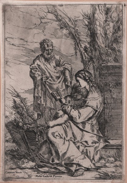 Acquaforte, 1650, firmata in lastra in basso a destra. Esemplare nel secondo stato di tre, con l’indirizzo dell’editore Matteo Cadorin aggiunto in basso al centro. Straordinaria prova, caratterizzata dal plate-tone tipico delle prime tirature, impressa su carta vergata coeva con filigrana non leggibile, con piccoli margini, in eccellente stato di conservazione. Il graffio di lastra visibile alla destra del San Giuseppe è tipico di tutte le prove del primo e secondo stato. Giulio Carpioni (1613-1679) fu seguace del Parmigianino e poi del veronese Ottino del quale subì influenze di eco caravaggesca, il Carpioni è uno dei più interessanti interpreti del classicismo neo venezianeggiante del Seicento in Italia settentrionale. Unendo esperienze più varie, che vanno dal realismo lombardo al classicismo bolognese e soprattutto poussiniano, conosciuto forse tramite le stampe di Pietro Testa, l’artista raggiunge un linguaggio figurativo personalissimo, tra i più interessanti della contemporanea pittura veneta, legati soprattutto alle sue celebri raffigurazioni di baccanali e scene pastorali popolate di ninfe e satiri. Questi temi sono svolti dal Carpioni anche in qualche acquaforte, tecnica che interessò l’artista ' limitatamente a pochi pezzi realizzati, assai rari e tutti pervasi di quello spirito di classicismo affine alle opere realizzate da Poussin nel suo primo periodo romano, alla produzione giovanile di Pietro Testa e di Giovanni B. Castiglione. Notissimo per la sua attività pittorica, si dedicò all’incisione nel periodo iniziale della sua carriera, quasi in fase sperimentale, utilizzando il mezzo incisorio come ricerca espressiva e di forma. Bibliografia Bartsch / Le Peintre graveur (XX.181.5); Calabi 1921 / The etchings of Giulio Carpione (3.II); Mazzoli 2008 / Giulio Carpioni incisore tra classicismo e barocco (5) Etching, 1650, signed on plate at lower right. Example in the second state of three, the address of the editor Matteo Cadorin added at bottom centre. Exceptional proof, characterised by the plate-tone typcal of the first impressions, on contemporary laid paper, unknown watermark, small margins, in very good conditions. The plate has a scratch, whose effects are visible at Saint Joseph's right, which is typical of all the proofs belonging to the first and second states. Giulio Carpioni was af follower of ' Parmigianino and afterwards of Ottino, whose influence led him to know Caravaggio, Carpioni was one of the most interesting artists of the XVII century neo-Venetian Classicism in Northern Italy. He put together various experiences coming from different Regions in Italy (Realism from Lombardy, classicims from Bologna and Poussin) to reach his peculiar and particular style among the most interesting in the contemporary Venetian painting; we have evidences of it in his Bacchanalia and in the landscapes with Nynphs and Satyrs. ' These subjects can be found also in some etching Carpioni realized; he was really fond of this particular technique, although he realized just a few pieces. His etchings, in any case, are extremely rare and they all reveal the influence Poussin had on his classicism and also the interest in Pietro Testa and Giovanni B. Castiglione. ' Carpioni is mainly famous for his paintings; his activity as etcher can be considered a sort of experimentation in his young age. Bibliographic references Bartsch / Le Peintre graveur (XX.181.5); Calabi 1921 / The etchings of Giulio Carpione (3.II); Mazzoli 2008 / Giulio Carpioni incisore tra classicismo e barocco (5) Cfr.