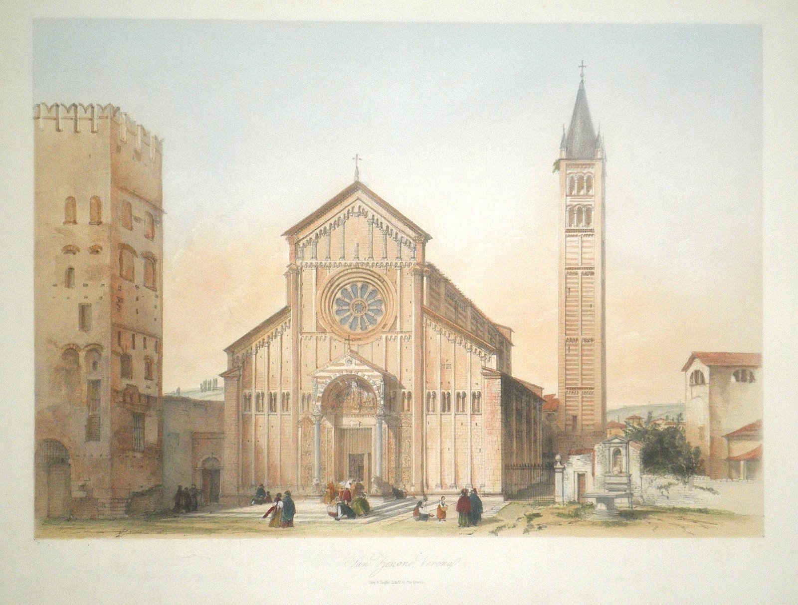 Litografia dipinta a mano, titolata e firmata in basso su ambo i lati. Mm 274x389, tratta dal volume " The Ecclesiastical Architecture of Italy. From the time of Costantine to the fifteenth Century, with an introduction and text by Henry Gally Knight". Bellissima immagine della Basilica di San Zeno con scena animata sul sagrato. Ampi Margini. Carlo Perini-Cesare Sinistri "Verona nelle antiche stampe", 380.