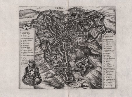 Veduta a volo d’uccello delle citta per la prima volta inserita in "ITINERARIUM ITALIAE NOV-ANTIQUAE: ODER, RAISS-BESCHREIBUNG DURCH ITALIEN … FRANCOFORTE : MATTHAUS MERIAN, 1640" di Martin Zeiler, opera illustrata dalle tavole di Mattheus Merian.Successivamente la troviamo inserita in alcune edizioni della "Newe archontologia cosmica" del Merian, e nella successiva ristampa dell'opera sull'Italia, il "Topographia Italiae" del 1688. Matthäus Merian il vecchio (1593-1650) incisore svizzero nativo di Basilea, lavorò a Francoforte dove ebbe modo di lavorare nella bottega fondata da Theodor de Bry. Merian si segnalò, tanto da sposare Maria Magdalena de Bry, figlia di Johann Theodore de Bry, e dal 1625 circa da prendere in mano l'azienda, dandole un notevole incremento ed occupandosi in particolare dello sviluppo dei libri di topografia e di viaggi. Nella tipografia Merian lavorarono anche i figli Kaspar e soprattutto il quotato Matthaeus il giovane, i quali dopo la morte del padre proseguirono con immutato successo la gestione dell'attività che continuò fino al 1727. Nel 1638 Merian stampò la Neuwe Archontologia cosmica, das ist, Beschreibung aller Kaÿserthumben, Königreichen und Republicken der gantzen Welt opera sulla descrizione del Mondo già uscita dieci anni prima con una veste modesta che Merian rivoluzionò arricchendola con 98 tavole alcune delle quali a doppio foglio. L'Archontologia conobbe altre quattro edizioni fino al 1695 con testo o in latino o in tedesco, non omogenee per numero e tipologia di incisioni inserite. Nel 1640 venne pubblicato Itinerarium Italiæ Nov-antiquæ scritto da Martin Zeiller, ristampato nel 1688 col titolo Topographiæ Italiæ. Incisione in rame, in ottimo stato di conservazione. Striking birdseye view of Siena, with two extensive keys and a coat of arms, from "Topographia Italiae." By Martin Zeiler. Matthäus Merian the Elder (1593-1650) Swiss engraver native of Basel, worked in Frankfurt where he was able to work in the workshop founded by Theodor de Bry. Merian distinguished himself, so much so that he married Maria Magdalena de Bry, daughter of Johann Theodore de Bry, and from about 1625 he took over the company, giving it a considerable increase and dealing in particular with the development of topography and travel books. The Kaspar sons and above all the renowned Matthaeus the younger also worked in the Merian typography, who after the death of their father continued with unchanged success the management of the business which continued until 1727. In 1638 Merian printed the Neuwe Archontologia cosmica, das ist, Beschreibung aller Kaÿserthumben, Königreichen und Republicken der gantzen Welt works on the description of the World already published ten years earlier with a modest look that Merian revolutionized by enriching it with 98 tables, some of which are double sheets. The Archontologia went through four other editions up to 1695 with text either in Latin or in German, not homogeneous in terms of the number and type of engravings inserted. In 1640 Itinerarium Italiæ Nov-antiquæ written by Martin Zeiller was published, reprinted in 1688 with the title Topographiæ Italiæ. Copperplate in very good conditions. Cfr. E. Pellegrini, "L'iconografia di Siena nelle opere a stampa", p. 117-118; C. de Seta, L'immagine delle città italiane dal XV al XIX secolo, p. 184 n. 96