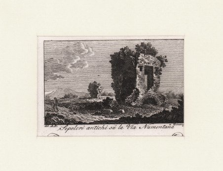 Veduta tratta dalla celebre Raccolta di num. 320 Vedute sì antiche, che moderne della città di Roma. …Incise a bulino in N. 80 rami, In Roma Nella Calcografia di Agapito Franzetti a Torsanguigna Col Permesso. ' L’opera si compone di un frontespizio calcografico e di 80 tavole numerate, ognuna composta da quattro vedute. Viene stampata senza data; molti repertori la datano intorno al 1790 circa, forse perché stampata su carta vergata. Una datazione intorno al 1800 ci sembra tuttavia più plausibile. ' Agapito Franzetti, calcografo attivo a Roma con bottega tra via del Corso e Torsanguigna, è noto per le sue piccole incisioni di veduta che servivano spesso come biglietti da visita. Tutte contengono, infatti, una linea in basso, dove si poteva apporre il proprio nome ad inchiostro. Come indicato nel titolo, le vedute raffigurano sia monumenti e antiche rovine che vedute “moderne”, con piazze, chiese e ville. Ciascuna tavola reca, in basso al centro, il nome dell’incisore. Gli artisti coinvolti sono sei: Jean-Jerome Baugean; Antonio Giuseppe Barbazza; Giovanni Battista Cipriani; Francesco Morelli; Antonio Poretta e Domenico Pronti. Molte delle vedute derivano dalla celebre opera di Giuseppe Vasi, Delle magnificenze di Roma antica e moderna. Pubblicata in 10 volumi dal 1747 al 1761, l’opera presenta 238 incisioni in rame, ciascuna incisione con testo narrativo che fornisce informazioni storiche e documentarie. ' Acquaforte, in buono stato di conservazione. ' Bibliografia: A. Bertarelli, H. Prior, Il biglietto da visita italiano. Cintributo alla storia del costume e dell'incisione nel secolo XVII, Bergamo 1911, p. 162. View of the city printed in Rome by the publisher Agapito Franzetti. Taken from Raccolta di num. 320 Vedute sì antiche, che moderne della città di Roma. …Incise a bulino in N. 80 rami, In Roma Nella Calcografia di Agapito Franzetti a Torsanguigna Col Permesso. ' The work consists of an intaglio frontispiece and 80 numbered plates, each consisting of four views. It is printed without date; many repertories date it around 1790, perhaps because it was printed on laid paper. A date around 1800 seems more plausible. Franzetti, a chalcographer working in Rome with a workshop between Via del Corso and Torsanguigna, is known for his small engravings of views that were often used as business cards. They all contain a line at the bottom where one's name could be written in ink. The small views were often printed four to a sheet. As indicated in the title, the views depict both monuments and ancient ruins and "modern" views, with squares, churches and villas. Each table bears, at the bottom center, the name of the engraver. There are six artists involved: Jean-Jerome Baugean; Antonio Giuseppe Barbazza; Giovanni Battista Cipriani; Francesco Morelli; Antonio Poretta and Domenico Pronti. ' The views are made after Giuseppe Vasi’s monumental work Delle magnificenze di Roma antica e moderna. Published in 10 volumes from 1747 to 1761, the work features 238 copper engravings, each engraving with a narrative text that provides historical and documentary information. Bibliografia: A. Bertarelli, H. Prior, Il biglietto da visita italiano. Contributo alla storia del costume e dell'incisione nel secolo XVII, Bergamo 1911, p. 162. Cfr.