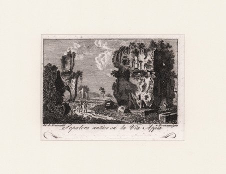 Veduta tratta dalla celebre ' Raccolta di num. 320 Vedute sì antiche, che moderne della città di Roma. …Incise a bulino in N. 80 rami, In Roma Nella Calcografia di Agapito Franzetti a Torsanguigna Col Permesso. ' L’opera si compone di un frontespizio calcografico e di 80 tavole numerate, ognuna composta da quattro vedute. Viene stampata senza data; molti repertori la datano intorno al 1790 circa, forse perché stampata su carta vergata. Una datazione intorno al 1800 ci sembra tuttavia più plausibile. ' Agapito Franzetti, calcografo attivo a Roma con bottega tra via del Corso e Torsanguigna, è noto per le sue piccole incisioni di veduta che servivano spesso come biglietti da visita. Tutte contengono, infatti, una linea in basso, dove si poteva apporre il proprio nome ad inchiostro. Come indicato nel titolo, le vedute raffigurano sia monumenti e antiche rovine che vedute “moderne”, con piazze, chiese e ville. Ciascuna tavola reca, in basso al centro, il nome dell’incisore. Gli artisti coinvolti sono sei: Jean-Jerome Baugean; Antonio Giuseppe Barbazza; Giovanni Battista Cipriani; Francesco Morelli; Antonio Poretta e Domenico Pronti. Molte delle vedute derivano dalla celebre opera di Giuseppe Vasi, ' Delle magnificenze di Roma antica e moderna. Pubblicata in 10 volumi dal 1747 al 1761, l’opera presenta 238 incisioni in rame, ciascuna incisione con testo narrativo che fornisce informazioni storiche e documentarie. ' Acquaforte, in buono stato di conservazione. ' Bibliografia: A. Bertarelli, H. Prior, ' Il biglietto da visita italiano. Contributo alla storia del costume e dell'incisione nel secolo XVII, Bergamo 1911, p. 162. View of the city printed in Rome by the publisher Agapito Franzetti. ' Taken from ' Raccolta di num. 320 Vedute sì antiche, che moderne della città di Roma. …Incise a bulino in N. 80 rami, In Roma Nella Calcografia di Agapito Franzetti a Torsanguigna Col Permesso. ' The work consists of an intaglio frontispiece and 80 numbered plates, each consisting of four views. It is printed without date; many repertories date it around 1790, perhaps because it was printed on laid paper. A date around 1800 seems more plausible. Franzetti, a chalcographer working in Rome with a workshop between Via del Corso and Torsanguigna, is known for his small engravings of views that were often used as business cards. They all contain a line at the bottom where one's name could be written in ink. The small views were often printed four to a sheet. As indicated in the title, the views depict both monuments and ancient ruins and "modern" views, with squares, churches and villas. Each table bears, at the bottom center, the name of the engraver. ' There are six artists involved: Jean-Jerome Baugean; Antonio Giuseppe Barbazza; Giovanni Battista Cipriani; Francesco Morelli; Antonio Poretta and Domenico Pronti. ' The views are made after Giuseppe Vasi’s monumental work ' Delle magnificenze di Roma antica e moderna. ' Published in 10 volumes from 1747 to 1761, the work features 238 copper engravings, each engraving with a narrative text that provides historical and documentary information. Bibliografia: A. Bertarelli, H. Prior, ' Il biglietto da visita italiano. Contributo alla storia del costume e dell'incisione nel secolo XVII, Bergamo 1911, p. 162. Cfr.