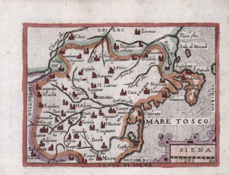 Carta in miniatura preparata per l’edizione italiana dell’Epitome theatri Orteliani, una riduzione delle carte del ' Theatrum Orbis Terrarum ' di Abraham Ortelius, pubblicata per la prima volta ad Anversa da Philip Galle nel 1577 con il titolo di ' Spieghel der werelt ' (Specchio del mondo). Nel 1593, sempre ad Anversa, viene alla luce il ' Theatro del mondo, l’edizione italiana dell’opera curata dal Galle. Nel 1598, Pietro Maria Marchetti, stampa a Brescia il ' Theatro del mondo, edizione “pirata” dell’opera originale del Galle, corredata da 109 mappe fatte incidere copiando le originali. Le carte vengo incise da un anonimo artista e inserite in una pagina di testo in italiano e furono usate anche per illustrare le "Relationi universali di Giovanni Botero", pubblicato sempre in Brescia nel 1599. È nota anche una ristampa delle stesse ' Relationi, pubblicata da Alessandro Vecchi a Venezia nel 1618 e ancora nel "Theatro del mondo" di Giovanni M. Turrini, (1655), e Scipione Banca (1657); queste due ultime edizioni recano il testo descrittivo al verso della carta. Esemplare dall'edizione del 1655 curata da Giovanni M. Turrini. Incisione in rame, finemente colorata a mano, in ottimo stato di conservazione. Rara. Bibliografia G. King, ' Miniature Antique Maps, ' pp. 78-79. Miniature map prepared for the Italian edition of the ' Epitome theatri Orteliani, ' a reduction of the maps of Abraham Ortelius' ' Theatrum Orbis Terrarum, first published in Antwerp by Philip Galle in 1577 under the title ' Spieghel der werelt (Mirror of the World). In 1593, also in Antwerp, the ' Theatro del mondo, ' the Italian edition of the work edited by Galle, came to light. In 1598, Pietro Maria Marchetti, printed in Brescia his ' Theatro del mondo, a "pirate" edition of Galle's original work, accompanied by 109 maps made by copying the originals. The maps were engraved by an anonymous artist and inserted into a page of Italian text and were also used to illustrate Giovanni Botero's "Relationi universali" also published in Brescia in 1599. A reprint of the same ' Relationi ' is also known, published by Alessandro Vecchi in Venice in 1618 and again in Giovanni M. Turrini's "Theatro del mondo" (1655), and Scipione Banca (1657); the latter two editions bear the descriptive text on the verso of the map. Map taken from ' Giovanni M. Turrini's "Theatro del mondo" (1655). Copperplate engraving, in very good condition. Rare. Bibliografia G. King, ' Miniature Antique Maps, ' pp. 78-79; ' Cfr.