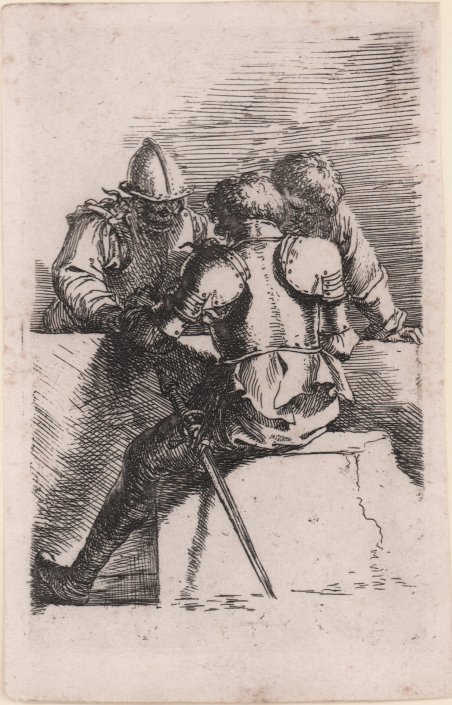 Acquaforte e puntasecca, 1656/8 circa, monogrammata in lastra. Della serie conosciuta come ' Diverse Figure. Bellissima prova, ricche di toni, impressa su carta vergata coeva, con sottili margini, in eccellente stato di conservazione. Esemplare in secondo stato, tutte con il monogramma; le prove di primo stato, ove esistano, sono senza monogramma e note in un solo esemplare. Conosciuta con il nome di ' Diverse Figure ' o ' Figurine, rappresentano senza dubbio l’opera grafica più famosa di Salvator Rosa. Già in epoca era considerata un modello per i giovani artisti, e venne più volte copiata sia in Italia che all’estero. Nelle figure dei soldati in costumi esotici oppure d’invenzione il Rosa svolge un tema trattato da molti incisori quali Callot, Della Bella e Filippo Liagno, con il quale aveva un rapporto stretto, e tramite il quale probabilmente arrivò a conoscere i soggetti dei lanzichenecchi del XV secolo di Dürer e Urs Graf. ' Una lettera dell’artista all’amico Ricciardi datata 1656 permette di datare la serie con sicurezza la periodo 1656/8. Bartsch elenca l’opera composta da 61 stampe, mentre Rotili e Wallace descrivano alcune rare variante dei soggetti, poi mai inserite nella serie, portando il numero delle Figurine a 72. Etching and drypoint, circa 1656/8, monogrammed in plate. From the series known as ' Diverse Figure. Beautiful proof, rich in tone, impressed on contemporary laid paper, with thin margins, in excellent condition. Example of the second state, sjowing the Rosa’s monogram; first-state proofs, where they exist, are unmonogrammed and known in only one copy. Known as ' Diverse Figure ' or ' Figurine, they are without doubt the most famous graphic work of Salvator Rosa. Already at that time it was considered a model for young artists, and was copied several times both in Italy and abroad. In the figures of soldiers in exotic or invented costumes, Rosa develops a theme treated by many engravers such as Callot, Della Bella and Filippo Liagno, with whom he had a close relationship, and through whom he probably came to know the subjects of the fifteenth-century Lansquenets by Dürer and Urs Graf. A letter from the artist to his friend Ricciardi dated 1656 allows the series to be dated with certainty to the period 1656/8. Bartsch lists the work as consisting of 61 prints, while Rotili and Wallace describe some rare variants of the subjects, later never included in the series, bringing the number of Figurine to 72. Cfr. Bartsch 55 II/III; Wallace 52 II/II.