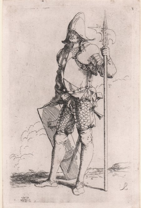Acquaforte e puntasecca, 1656/8 circa, monogrammata in lastra. Della serie conosciuta come ' Diverse Figure. Bellissima prova, ricche di toni, impressa su carta vergata coeva, con sottili margini, in eccellente stato di conservazione. Esemplare in secondo stato, tutte con il monogramma; le prove di primo stato, ove esistano, sono senza monogramma e note in un solo esemplare. Conosciuta con il nome di ' Diverse Figure ' o ' Figurine, rappresentano senza dubbio l’opera grafica più famosa di Salvator Rosa. Già in epoca era considerata un modello per i giovani artisti, e venne più volte copiata sia in Italia che all’estero. Nelle figure dei soldati in costumi esotici oppure d’invenzione il Rosa svolge un tema trattato da molti incisori quali Callot, Della Bella e Filippo Liagno, con il quale aveva un rapporto stretto, e tramite il quale probabilmente arrivò a conoscere i soggetti dei lanzichenecchi del XV secolo di Dürer e Urs Graf. ' Una lettera dell’artista all’amico Ricciardi datata 1656 permette di datare la serie con sicurezza la periodo 1656/8. Bartsch elenca l’opera composta da 61 stampe, mentre Rotili e Wallace descrivano alcune rare variante dei soggetti, poi mai inserite nella serie, portando il numero delle Figurine a 72. Etching and drypoint, circa 1656/8, monogrammed in plate. From the series known as ' Diverse Figure. Beautiful proof, rich in tone, impressed on contemporary laid paper, with thin margins, in excellent condition. Example of the second state, sjowing the Rosa’s monogram; first-state proofs, where they exist, are unmonogrammed and known in only one copy. Known as ' Diverse Figure ' or ' Figurine, they are without doubt the most famous graphic work of Salvator Rosa. Already at that time it was considered a model for young artists, and was copied several times both in Italy and abroad. In the figures of soldiers in exotic or invented costumes, Rosa develops a theme treated by many engravers such as Callot, Della Bella and Filippo Liagno, with whom he had a close relationship, and through whom he probably came to know the subjects of the fifteenth-century Lansquenets by Dürer and Urs Graf. A letter from the artist to his friend Ricciardi dated 1656 allows the series to be dated with certainty to the period 1656/8. Bartsch lists the work as consisting of 61 prints, while Rotili and Wallace describe some rare variants of the subjects, later never included in the series, bringing the number of Figurine to 72. Cfr. Bartsch 44 stato unico; Wallace 37 stato unico.