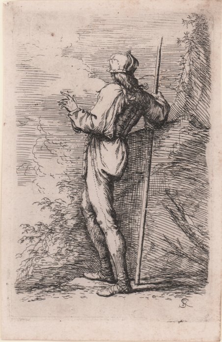 Acquaforte e puntasecca, 1656/8 circa, monogrammata in lastra. Della serie conosciuta come ' Diverse Figure. Bellissima prova, ricche di toni, impressa su carta vergata coeva, con sottili margini, in eccellente stato di conservazione. Esemplare in secondo stato, tutte con il monogramma; le prove di primo stato, ove esistano, sono senza monogramma e note in un solo esemplare. Conosciuta con il nome di ' Diverse Figure ' o ' Figurine, rappresentano senza dubbio l’opera grafica più famosa di Salvator Rosa. Già in epoca era considerata un modello per i giovani artisti, e venne più volte copiata sia in Italia che all’estero. Nelle figure dei soldati in costumi esotici oppure d’invenzione il Rosa svolge un tema trattato da molti incisori quali Callot, Della Bella e Filippo Liagno, con il quale aveva un rapporto stretto, e tramite il quale probabilmente arrivò a conoscere i soggetti dei lanzichenecchi del XV secolo di Dürer e Urs Graf. ' Una lettera dell’artista all’amico Ricciardi datata 1656 permette di datare la serie con sicurezza la periodo 1656/8. Bartsch elenca l’opera composta da 61 stampe, mentre Rotili e Wallace descrivano alcune rare variante dei soggetti, poi mai inserite nella serie, portando il numero delle Figurine a 72. Etching and drypoint, circa 1656/8, monogrammed in plate. From the series known as ' Diverse Figure. Beautiful proof, rich in tone, impressed on contemporary laid paper, with thin margins, in excellent condition. Example of the second state, sjowing the Rosa’s monogram; first-state proofs, where they exist, are unmonogrammed and known in only one copy. Known as ' Diverse Figure ' or ' Figurine, they are without doubt the most famous graphic work of Salvator Rosa. Already at that time it was considered a model for young artists, and was copied several times both in Italy and abroad. In the figures of soldiers in exotic or invented costumes, Rosa develops a theme treated by many engravers such as Callot, Della Bella and Filippo Liagno, with whom he had a close relationship, and through whom he probably came to know the subjects of the fifteenth-century Lansquenets by Dürer and Urs Graf. A letter from the artist to his friend Ricciardi dated 1656 allows the series to be dated with certainty to the period 1656/8. Bartsch lists the work as consisting of 61 prints, while Rotili and Wallace describe some rare variants of the subjects, later never included in the series, bringing the number of Figurine to 72. Cfr. Bartsch 43 II/II; Wallace 36 II/II.